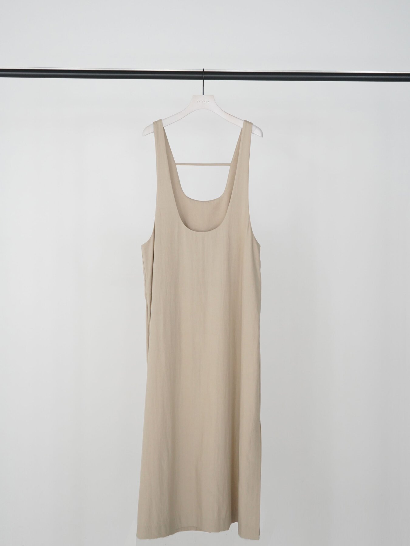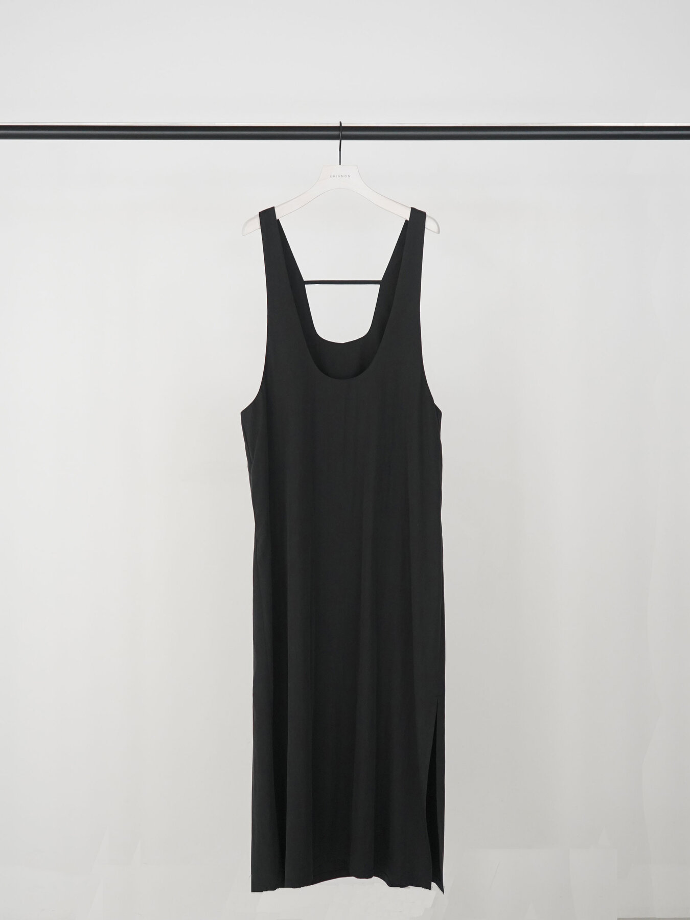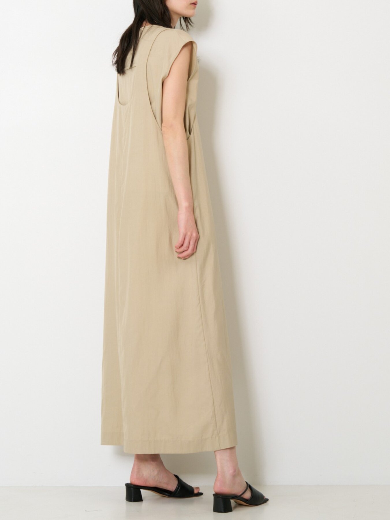 インナーとのレイヤードを楽しむために設計された、デザインをそぎ落としたミニマルなジャンパースカート。