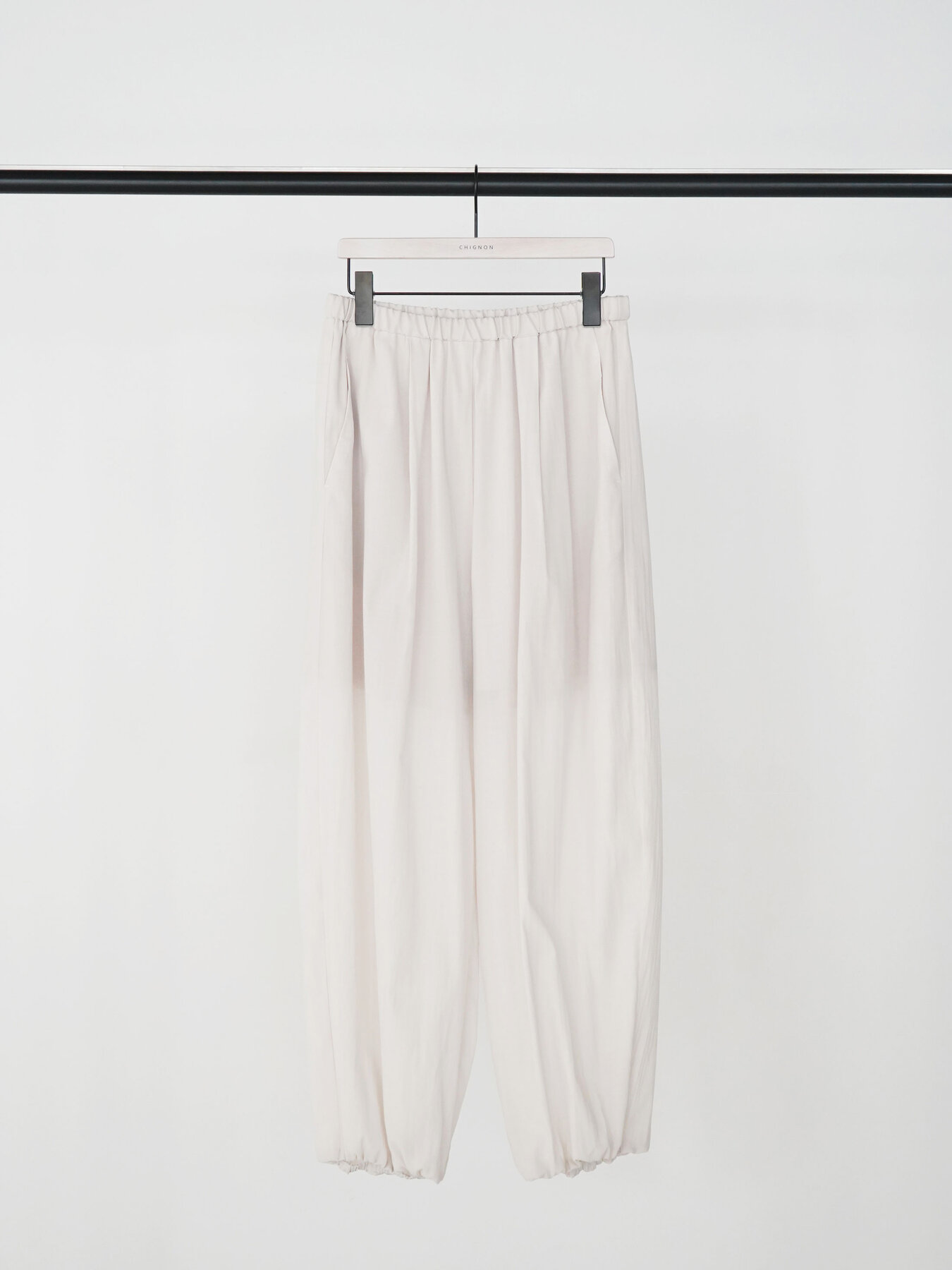 裾にはゴムを入れ、さらにゴムを内側に巻き込む仕様にすることで、カジュアル感を抑え、きれいめなモード感をプラス。