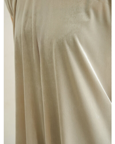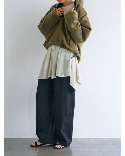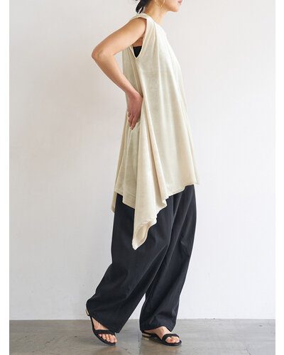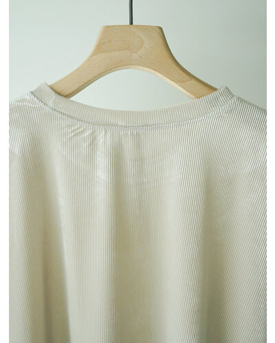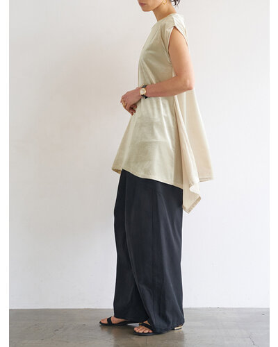 ベルベットの畝が生み出す立体感と、やわらかな起毛の光沢が印象的。落ち着いた表情の中に奥行きを感じさせる、秋らしい素材感が魅力です。両サイドにマチ切替を入れ、裾はイレギュラーヘム仕様に。動きに合わせて揺れるラインが自然なニュアンスをつくり、腰まわりやヒップラインをさりげなくカバーします。袖口はふんわりと折り返したデザインを採用。肩先をやわらかく覆うフレンチスリーブで、カジュアルすぎず上品なバランスに仕上げました。アウターやベスト、トップスの下に重ねると、イレヘムの裾がレイヤードのアクセントに。トレンドのレイヤードスタイルを、秋らしい素材感でアップデートしてくれる、深みのある表情で魅せる、大人のためのレイヤードチュニック。