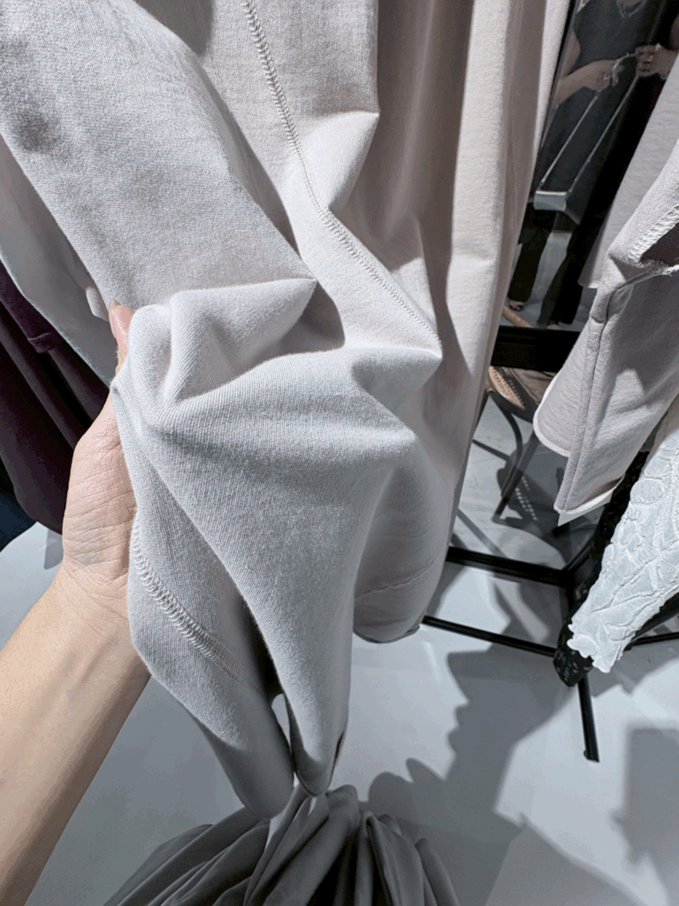 カジュアルな裏毛素材ながら、タイトなカーブで切り替えた立体的なラインが印象的。