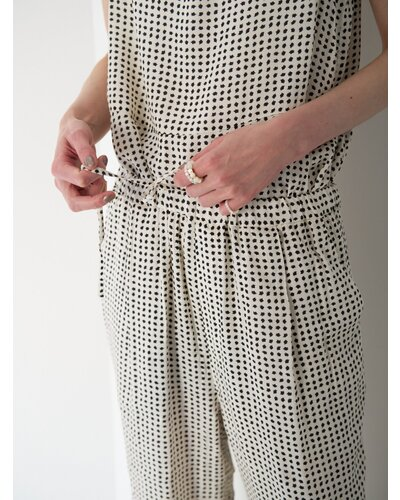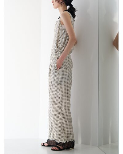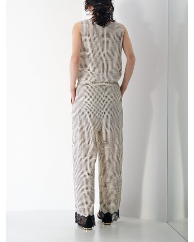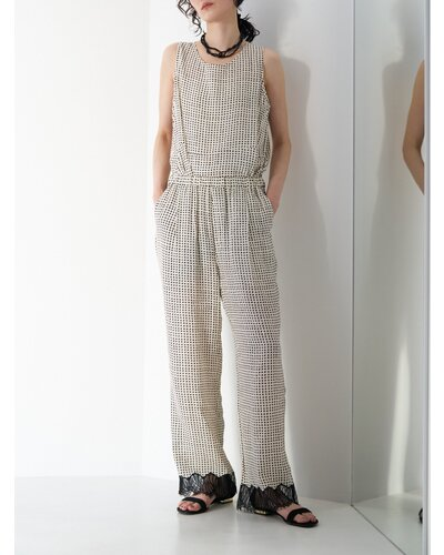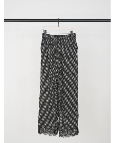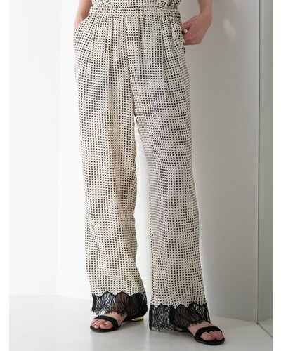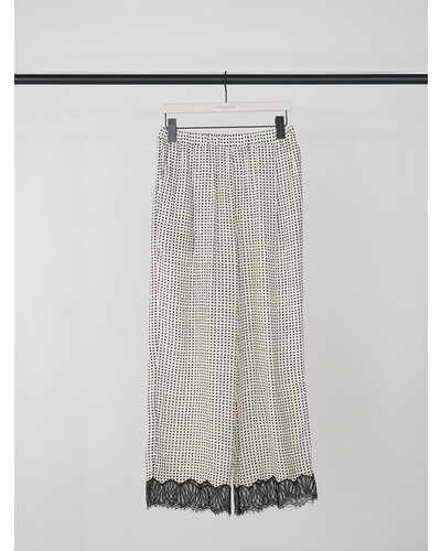 小粒の変形ドット柄に裾レースを刺繍した、軽やかな印象のイージーパンツ。
