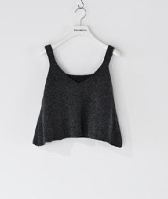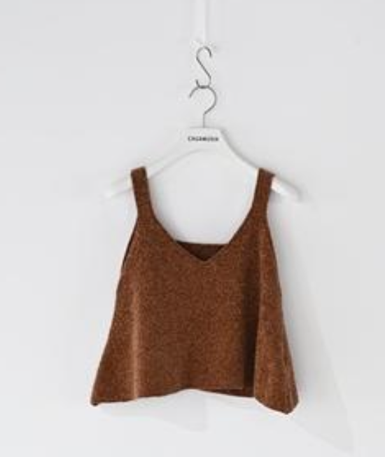 やわらかなモールヤーンで編み立てたビスチェ。女性らしいカットの襟ぐりがデコルテを美しく見せ、シンプルな
