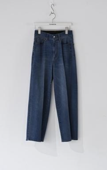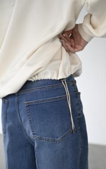テージ加工とワンウォッシュの濃色インディゴの2色展開です。ウエストにはゴムを内蔵し、ギャザーを出さずに伸縮性を確保。
