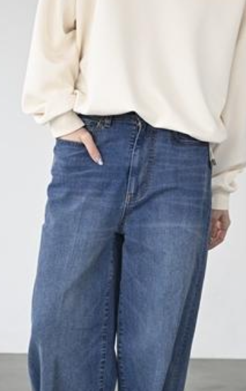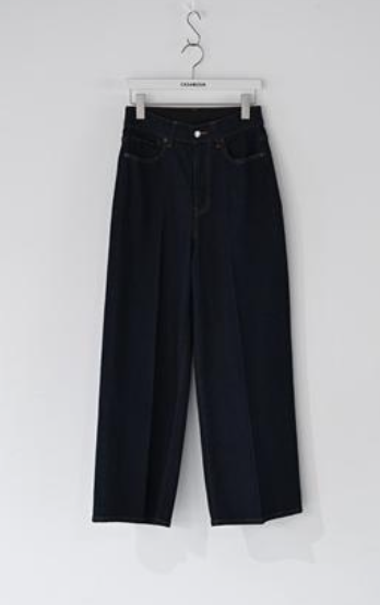 スラックスのパターンで仕立てた、きれいめな印象のデニムワイドパンツ。センタークリースを入れることで縦のラインを強調
