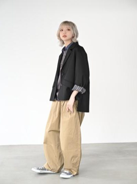 ゆとりを持たせたワイドシルエットのテーラードジャケット。きちんと感を備えながらも、どこかブルゾンのように軽やかに羽織