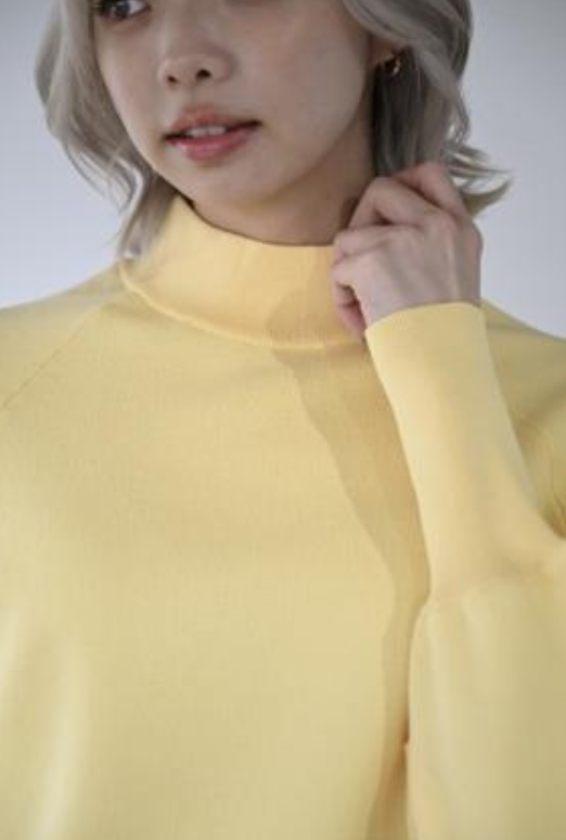 しっかりとしたゴム地でフォルムを描いたハイネックセーター。程よいハリのある素材が身体のラインを拾いにく