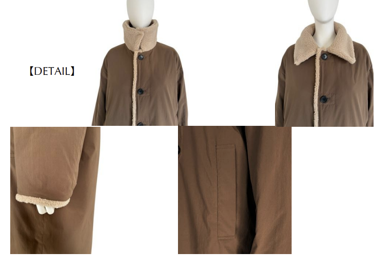 表側はマットな質感と柔らかさが特徴のポリエステル素材を使用。控えめなワッシャー加工が生地表面にニュアンスを与えています。裏側はマットな質感でソフトなポリエステルタフタにヘチマ柄キルティングを施しています。襟、前端、袖口にボアを使用。ポケット袋布にはライトフリースを使用し、暖かいハンドウォーム機能も備えています。