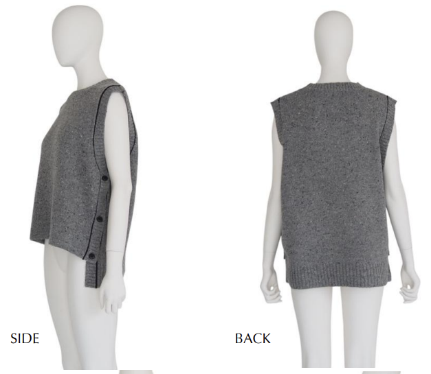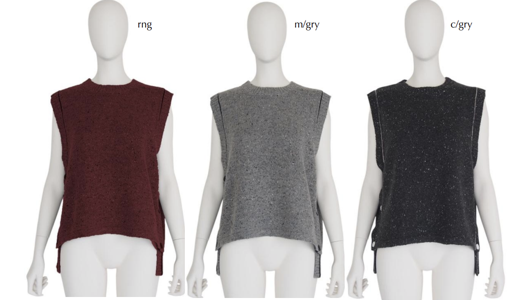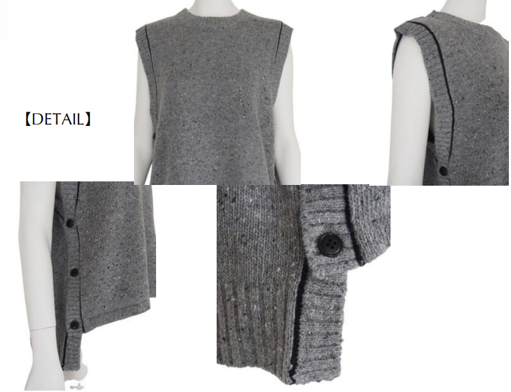 配色リンキングがアクセントになったラウンドネックのニットベスト。サイドに配したボタンデザインがポイントで、シンプルな中にさりげないディテールをプラスしています。前後差のある着丈で、レイヤードスタイルにも取り入れやすく、スタイリングに抜け感を与えてくれる1着です。