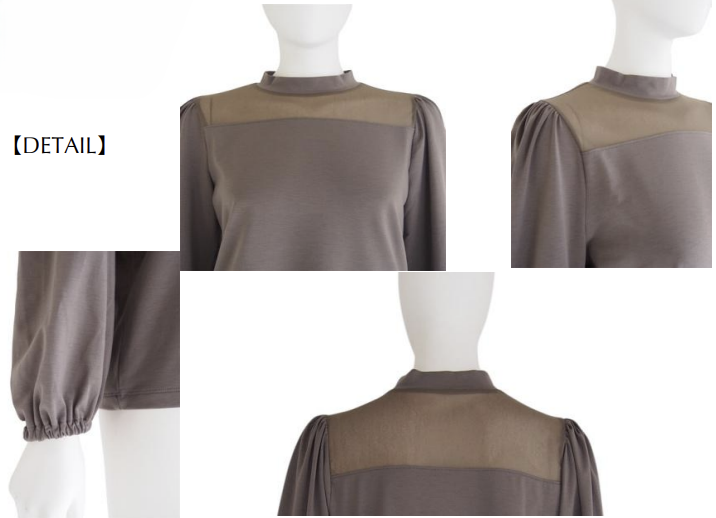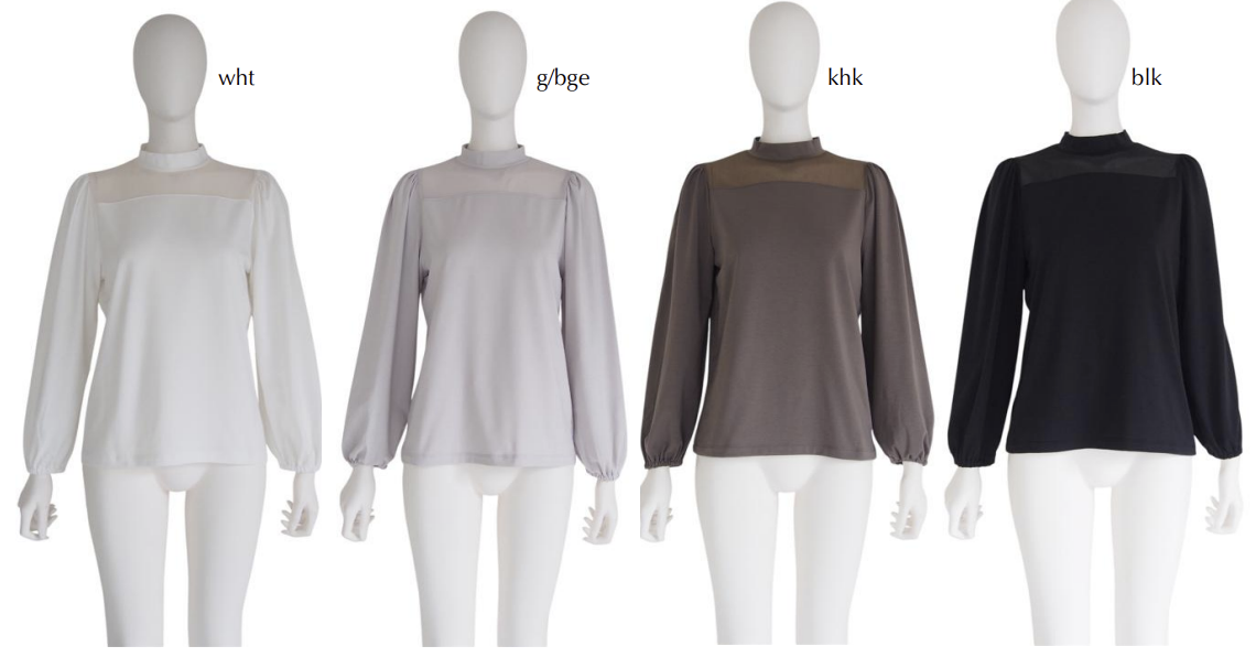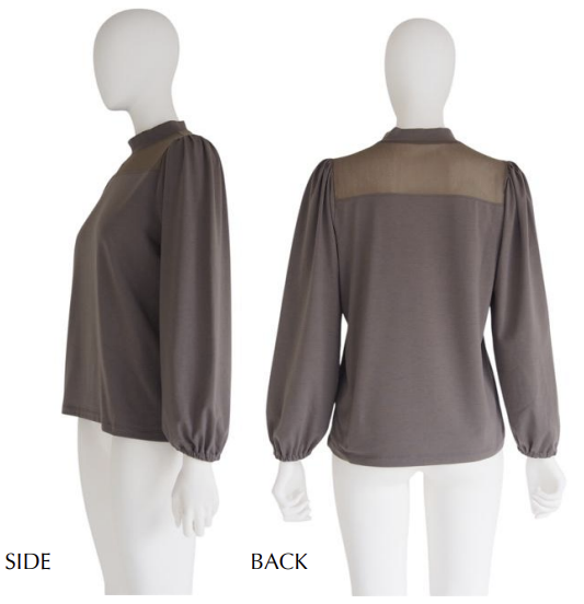 モックネックがクラシカルな印象を添えるトップス。デコルテ部分には繊細なシアー素材を切り替え、上品なアクセントをプラスしています。身頃には伸縮性のあるジャージ素材を使用し、快適な着心地を実現。程よい透け感が軽やかな表情を演出し、インナーとしても1枚着としても活躍する、スタイリングの幅が広がるアイテムです。