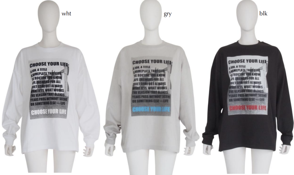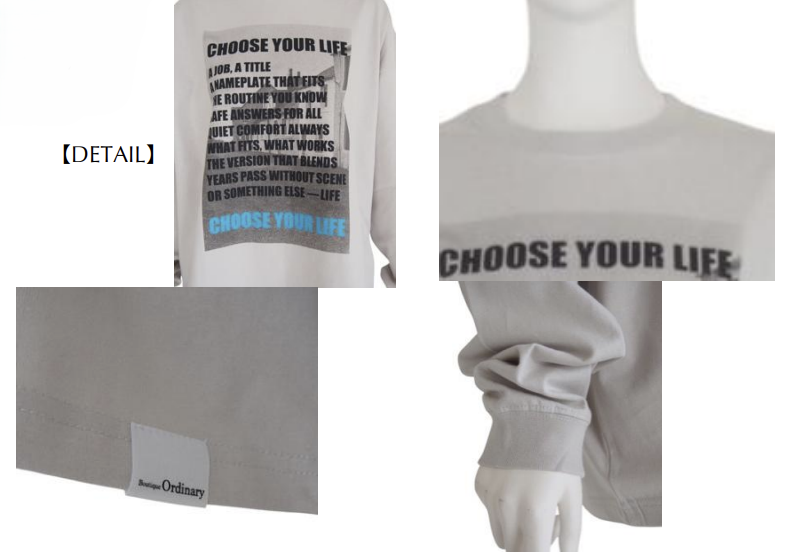 ゆったりとしたシルエットで、リラックス感のある着心地に仕上げたロングスリーブTシャツ。モノクロフォトに大胆なタイポグラフィを重ねたグラフィックが印象的なデザインです。“CHOOSE YOUR LIFE”のメッセージがさりげなくカルチャーの空気感を漂わせ、1枚でスタイリングのアクセントになるアイテムに仕上げました。