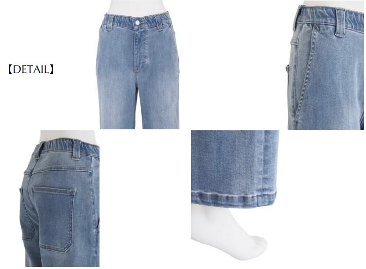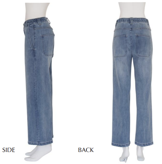 ウエストゴム仕様のワイドストレートデニムパンツ。程よいワイドシルエットが、リラックス感のある大人のスタイルを演出します。デニム特有のカジュアルさに、センタープレスによる立体感をプラスし、こなれた印象に仕上げました。やや大き目なヒップポケットがバックスタイルのアクセントとなります。ウエスト内側のゴムで見た目は損なわずイージーな穿き心地を実現させています。