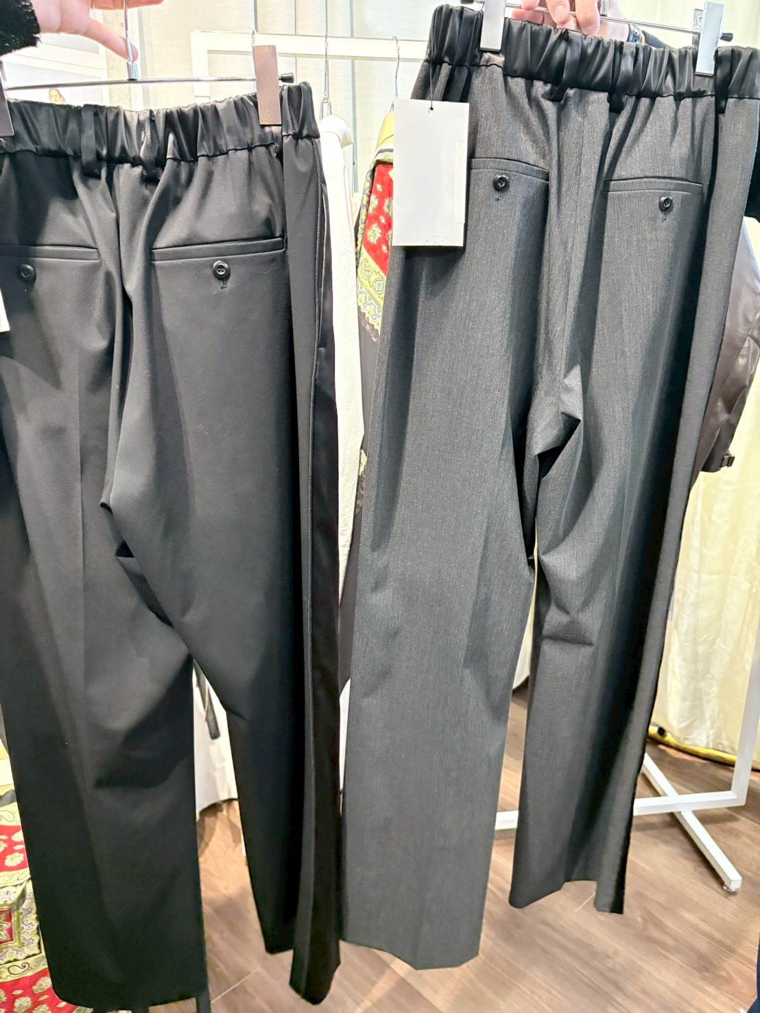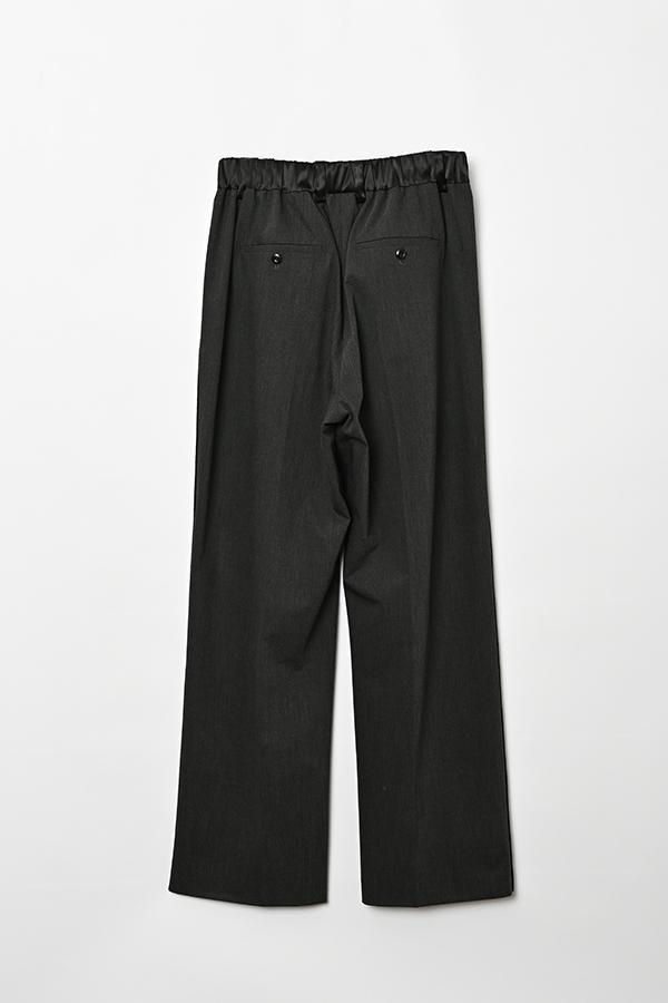 前ウエストはベルトループ仕様で端正に、後ろはゴム仕様で快適なフィット感に。