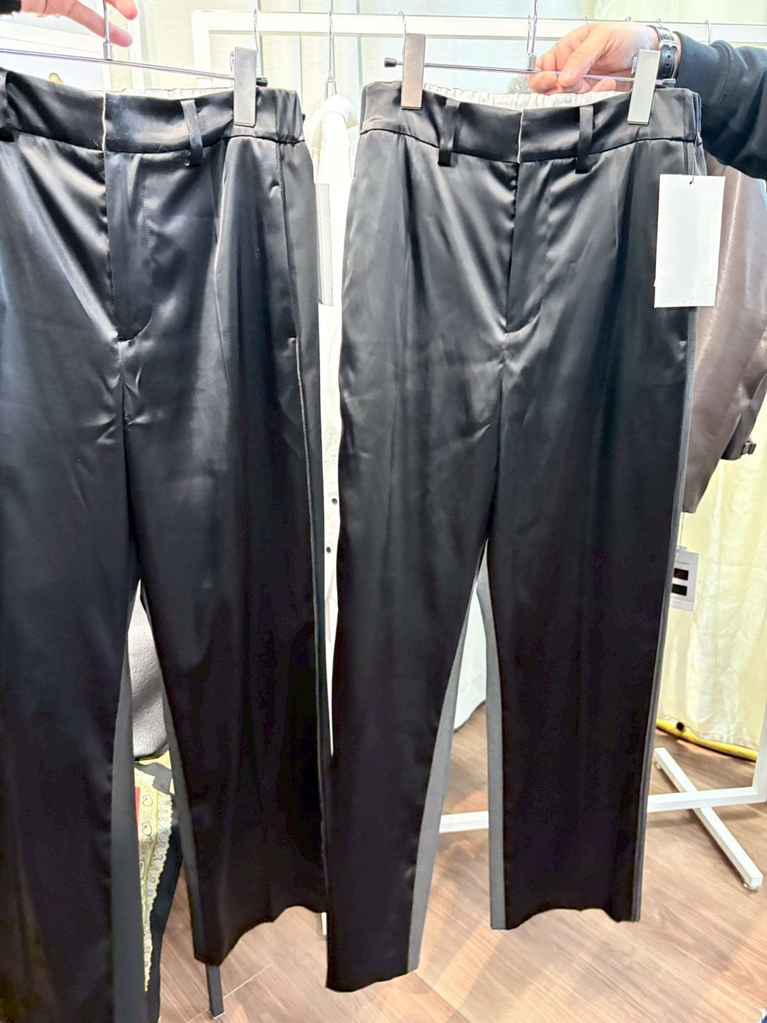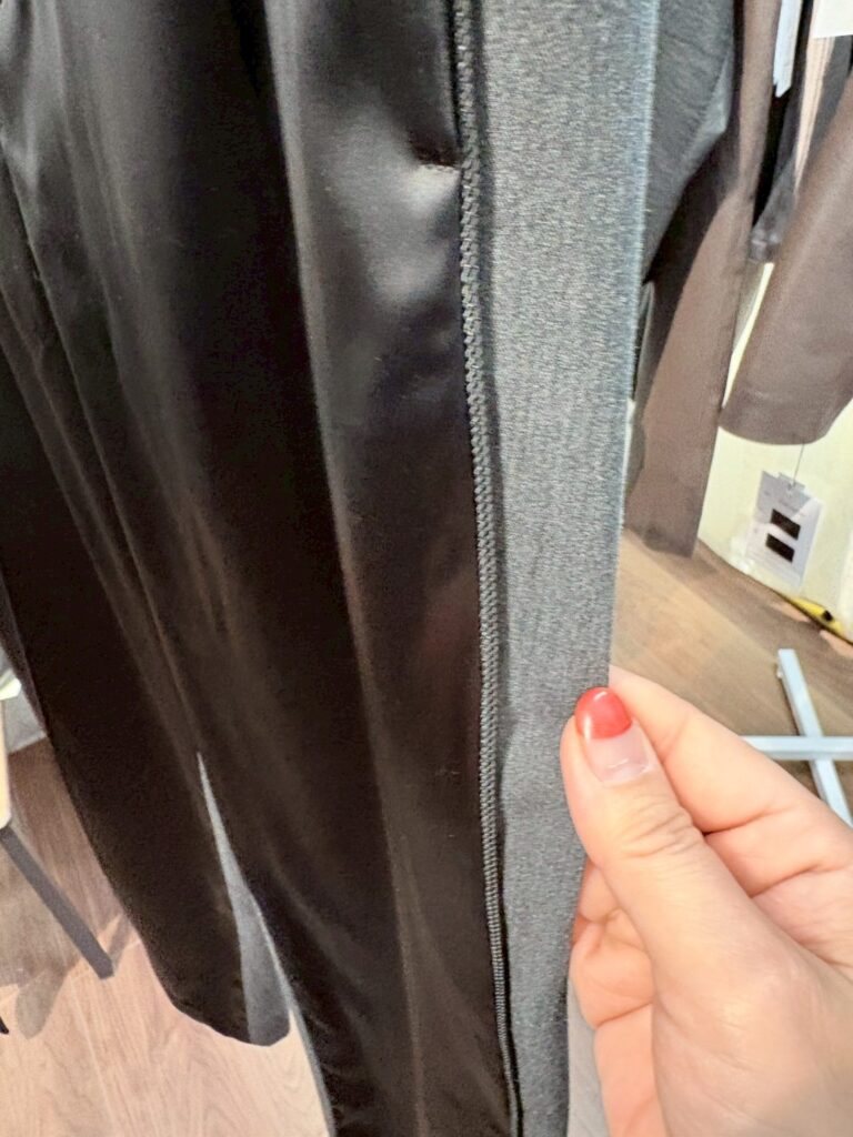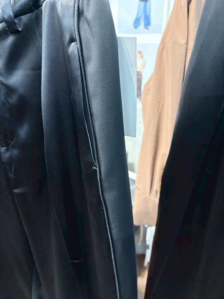 脇にはパイピングテープを挟み込み、シルエットを引き締めながらシャープなアクセントに。さりげないディテールが全体の印象を整える。