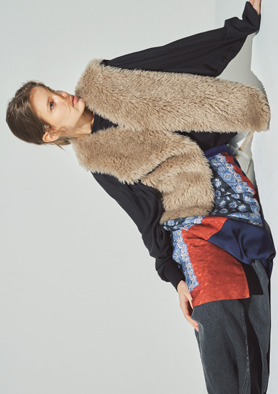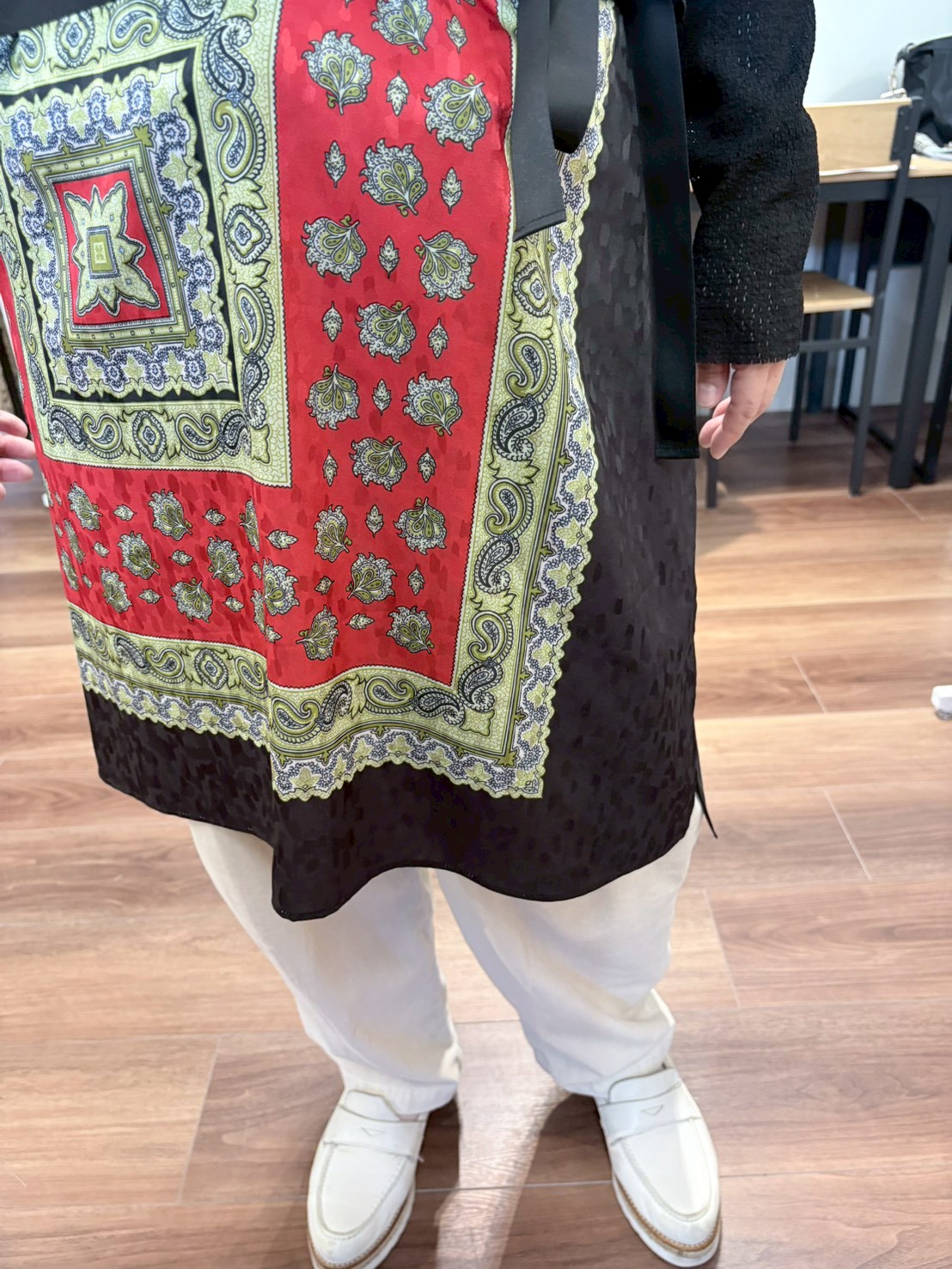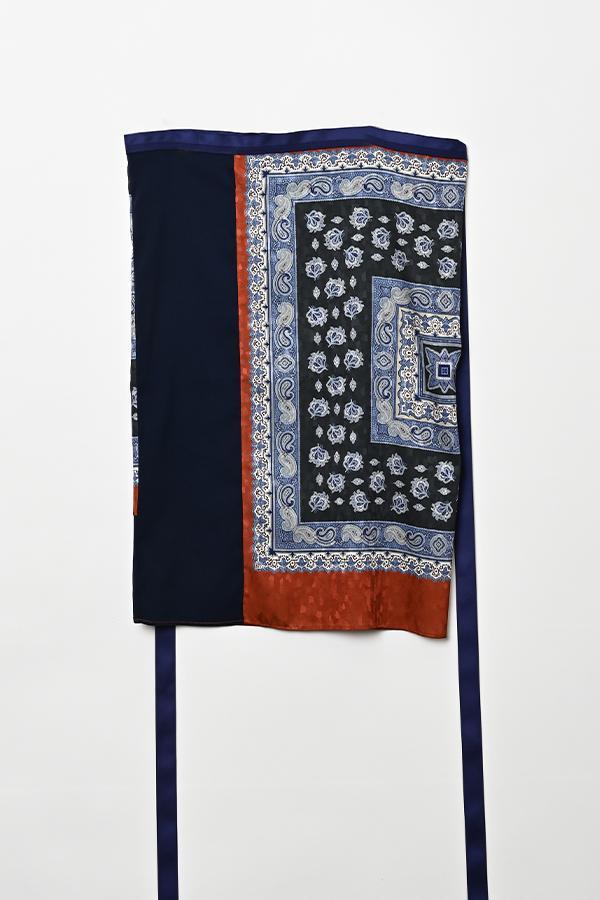 ヴィンテージのシルクスカーフから着想を得た、オリジナル柄を使用。スカーフ柄と無地を切り替えることで、コントラストの効いたデザインに仕上げた一枚。