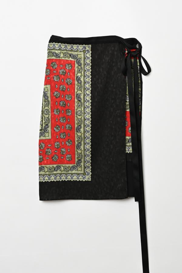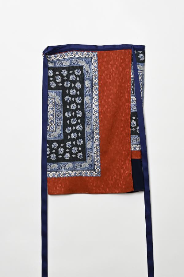贅沢に2パネルを用い、巻きスカートとしてはもちろん、スカーフとしても使えるマルチウェイ仕様。スタイリングやシーンに合わせて自在にアレンジできる。