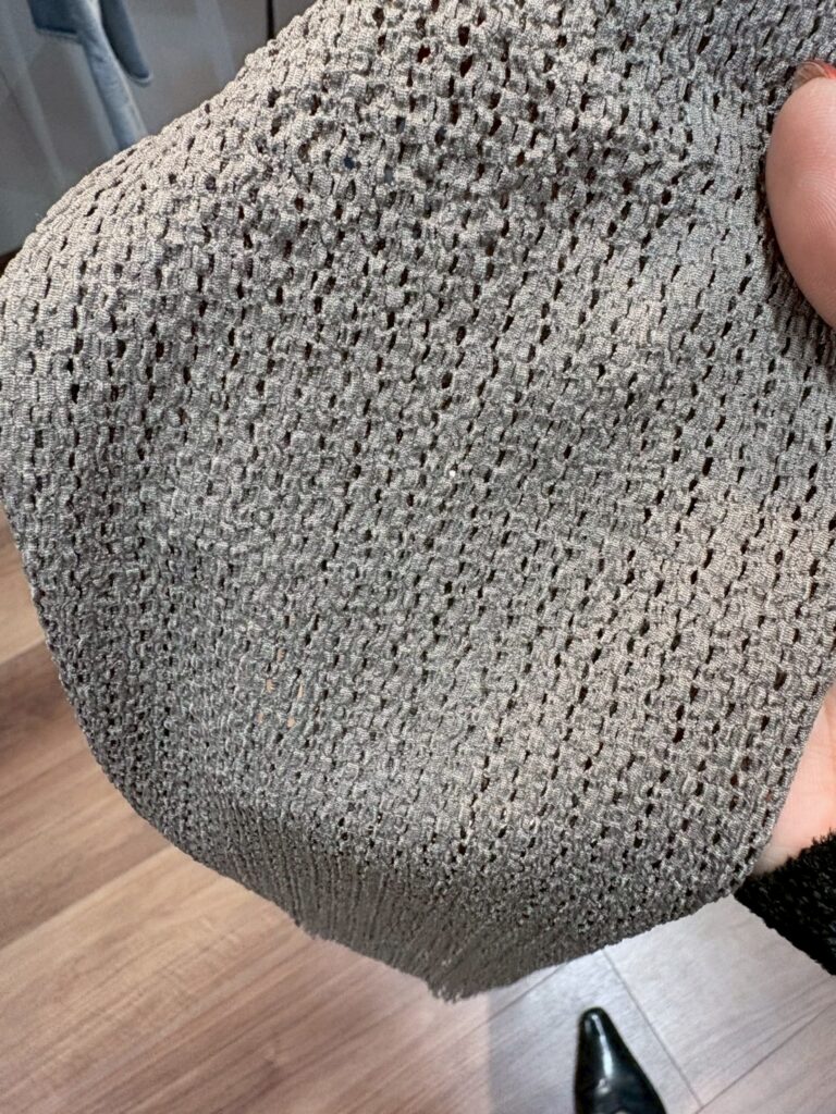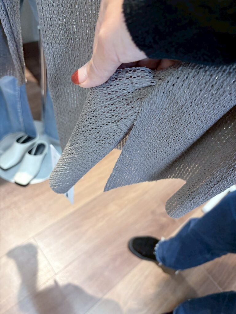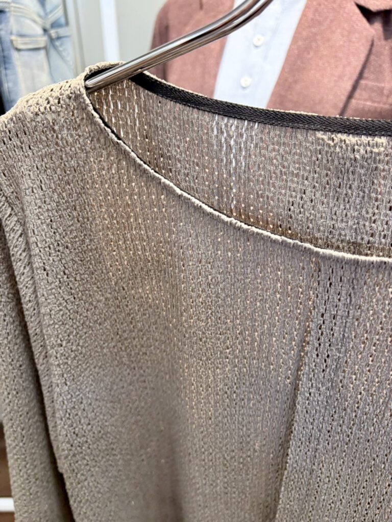 甘さに寄りすぎない表面感で、上品さの中にモードなエッセンスを添える素材。