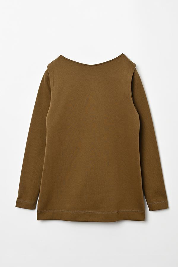 コットンとポリエステルを組み合わせた、プレーティング編みのカットソー素材を使用。表面は鹿の子編み特有の凹凸感により肌離れがよく、動きのある表情を生む。