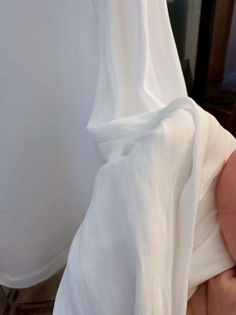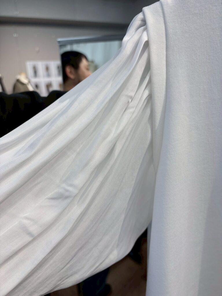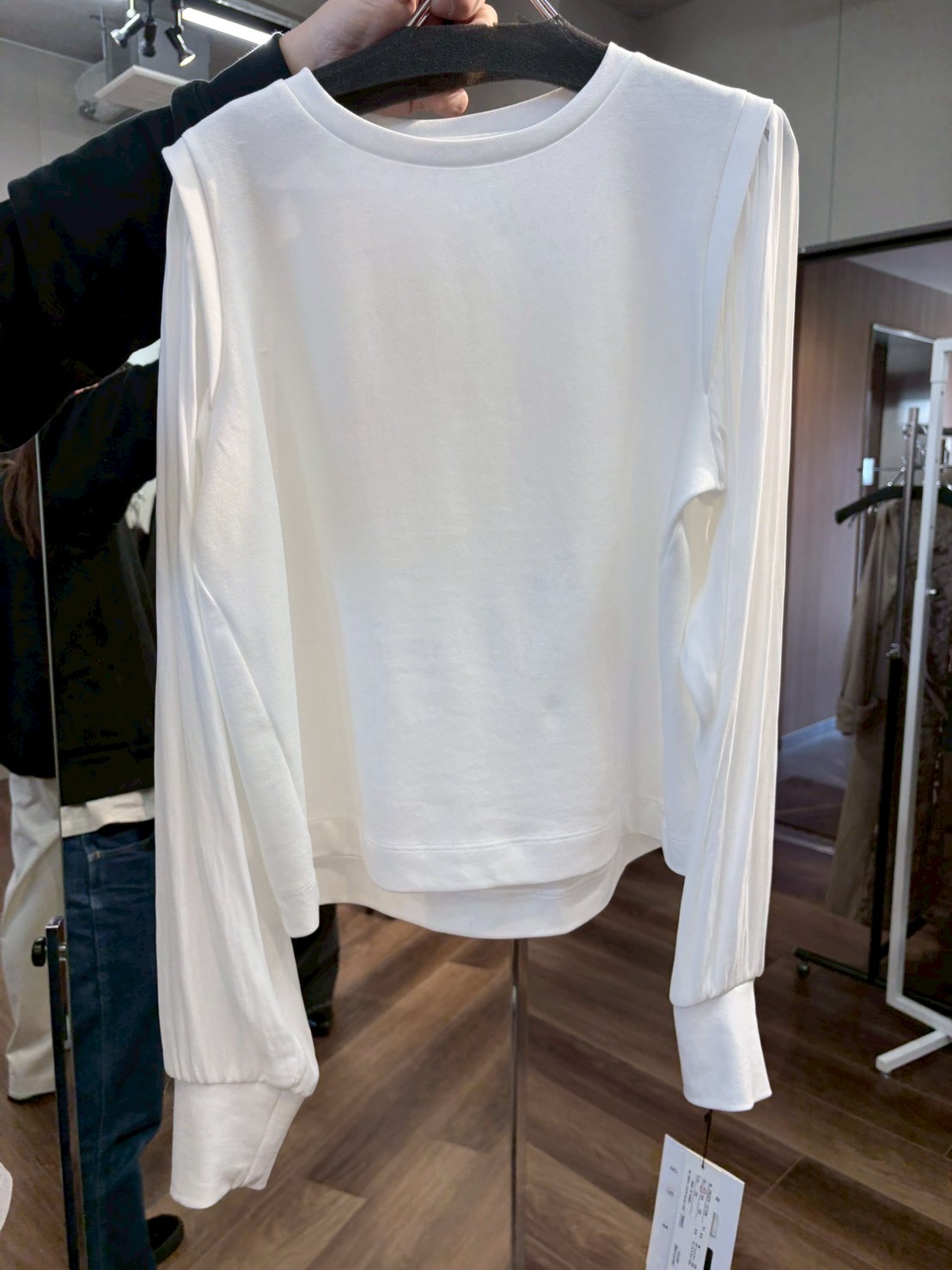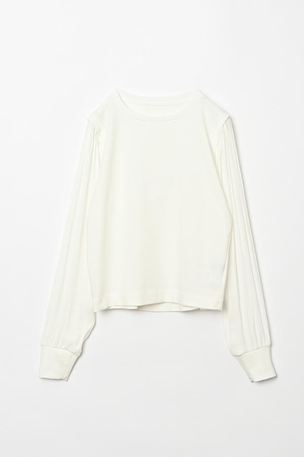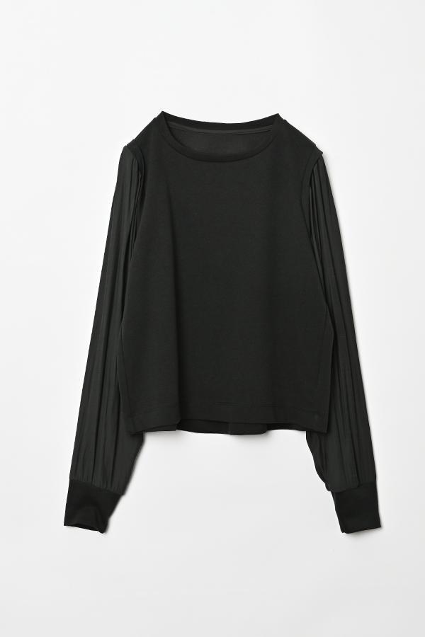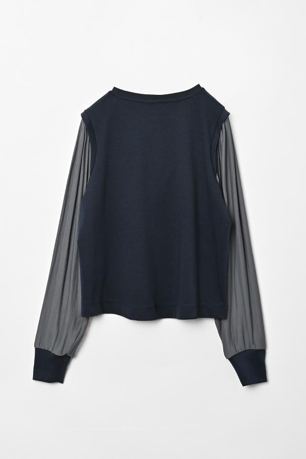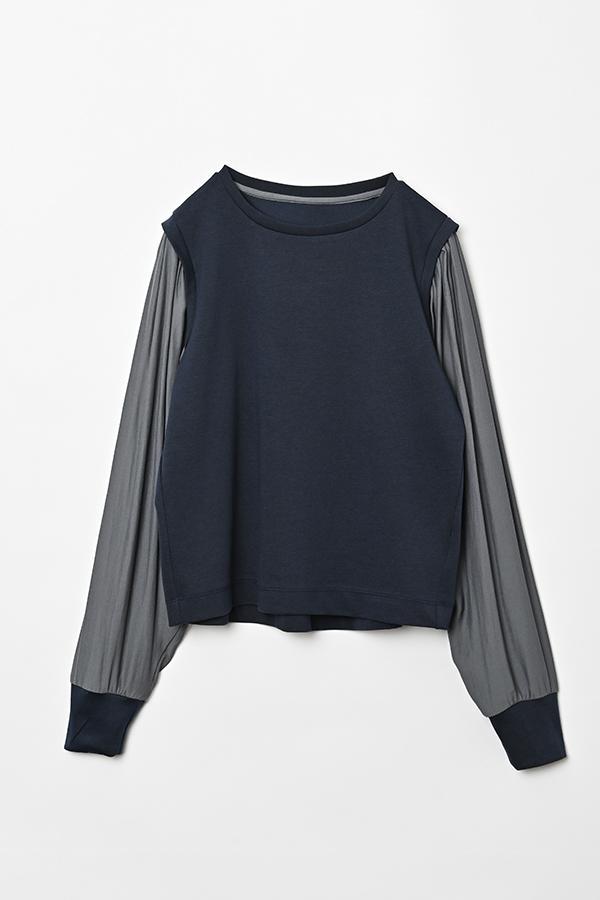 身頃はシンプルにまとめながら、袖には落ち感のあるサテン素材を使用。