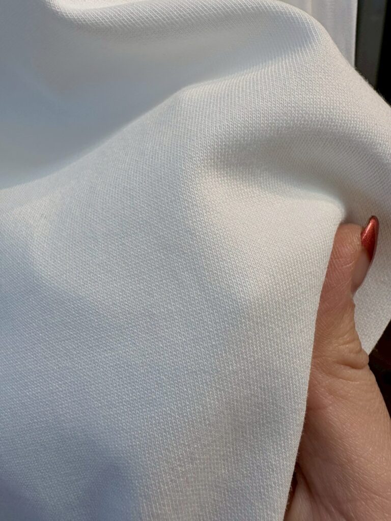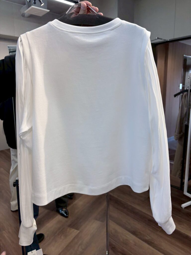 身頃には、コットンとポリエステルをブレンドしたカットソー素材を使用。やさしい肌触りと扱いやすさを兼ね備え、シワになりにくくデイリーに取り入れやすい。