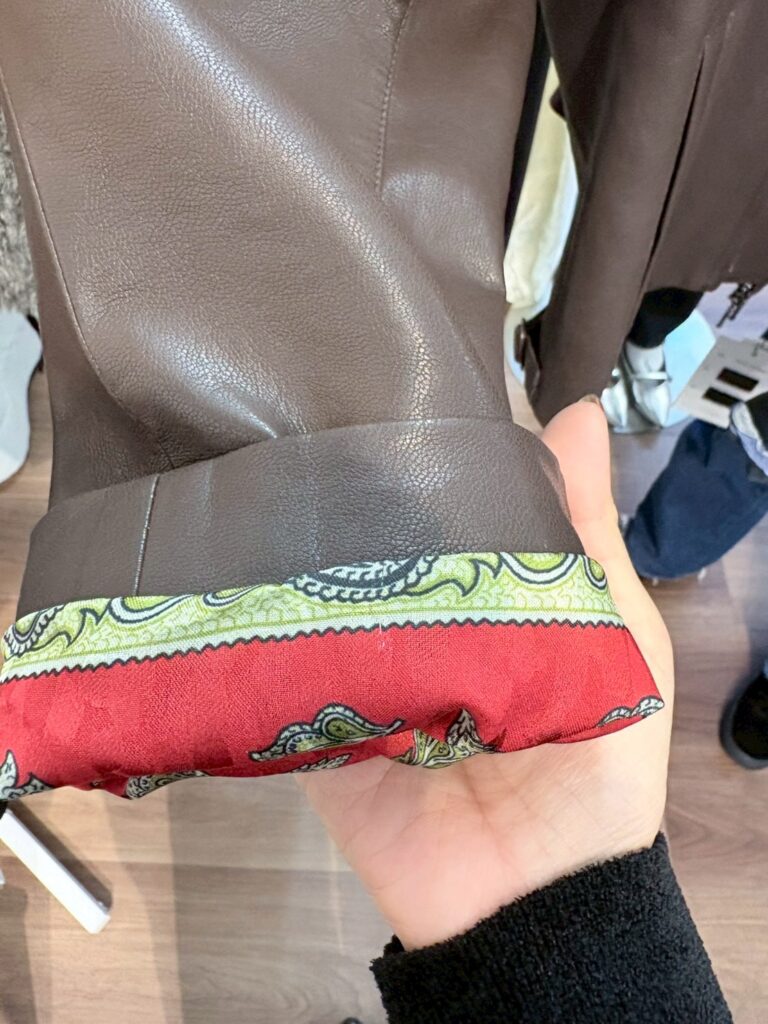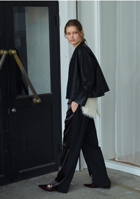 同素材のパンツと組み合わせることで、従来のエコレザーの印象にとらわれない、軽やかで新しいセットアップスタイルを提案。