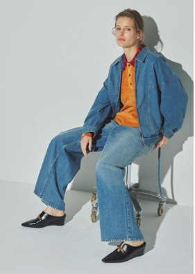 クレリック配色がさりげないアクセントとなり、顔まわりを引き締めるバランスに。体につかず離れすぎない絶妙なサイズ感で、一枚でもインナーとしても活躍。