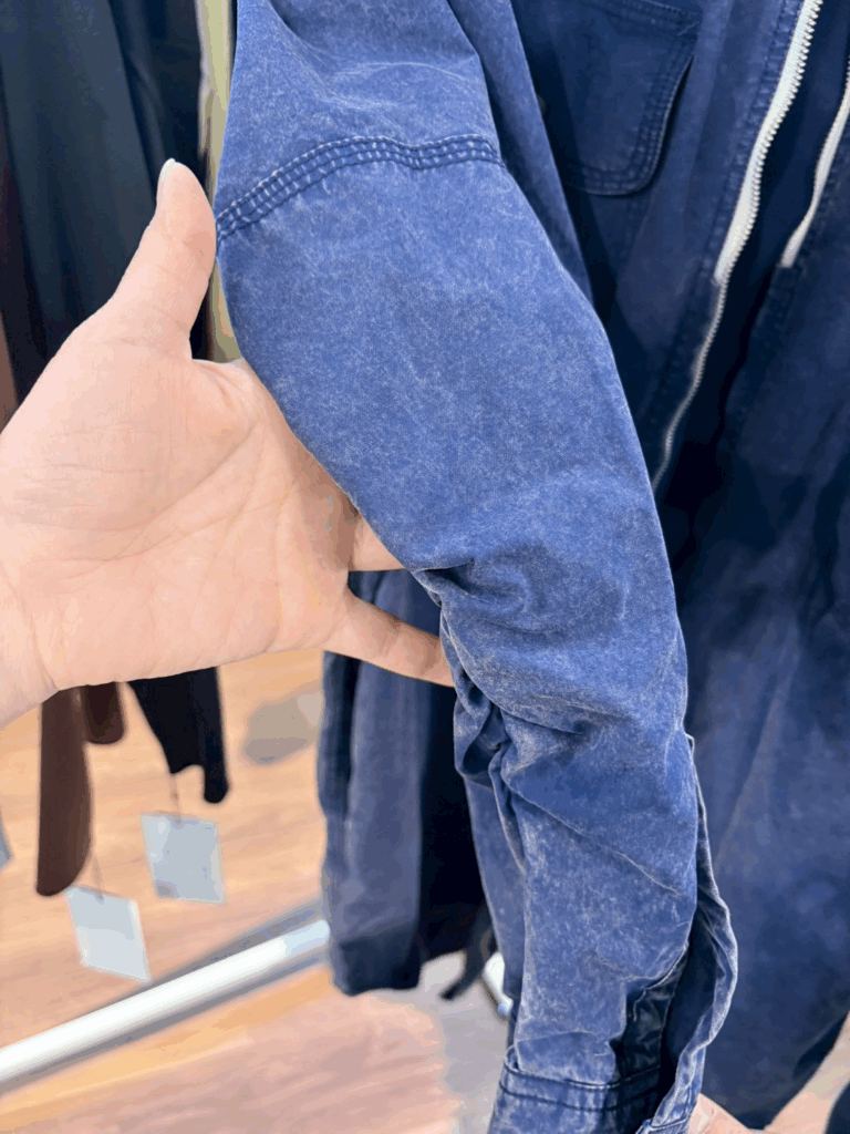 前あきはファスナー仕様でありながら、一部をあえて隠すことで、ハーフジップのようにも見える曖昧な表情に。開け方や見え方によって印象が変わり、シンプルな中に静かな違和感を生むデザインに仕上げている。