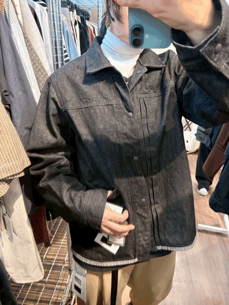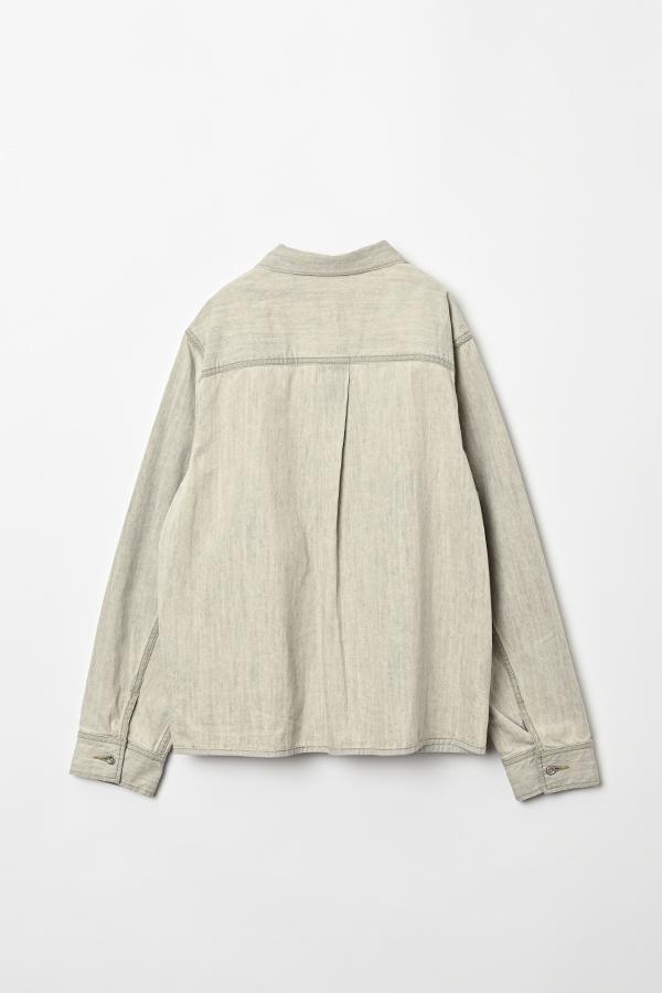 フロント裾はラウンドしたラインに仕上げ、重さを感じさせない柔らかな印象に。Gジャンのような構築感をほんのりと残しながらも、軽く羽織れるシャツとしての佇まいを引き出している。一部にはアクションプリーツのディテールを取り入れ、動きやすさと立体感をさりげなくプラス。機能から生まれた要素が、静かにデザインとして息づく。