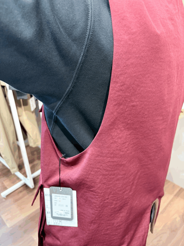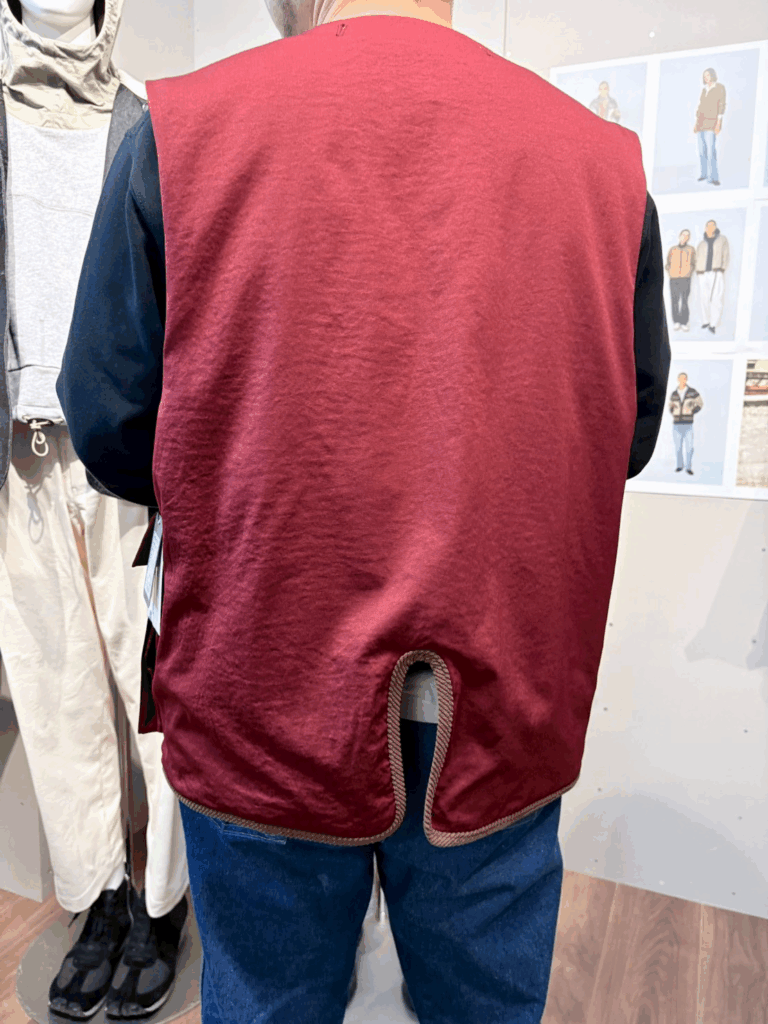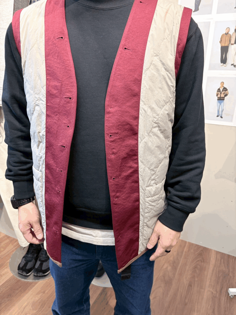 リバーシブル仕様で、着方によって表情と機能が切り替わる一着。今季のジャケットにドッキング可能な設計で、インナーとしてもアウターとしても自然に馴染むバランスに仕上げている。