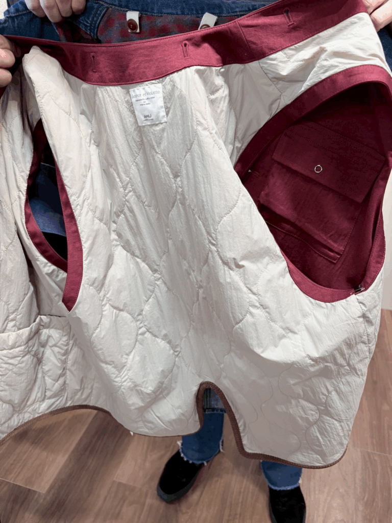 片面はポケットを多く備えた仕様で、収納力を高めた機能的なデザイン。もう片面はシンプルなキルティングで、すっきりとした印象に。用途に合わせて使い分けることで、日常のスタイリングにさりげない変化を生む。