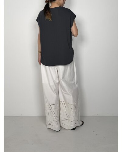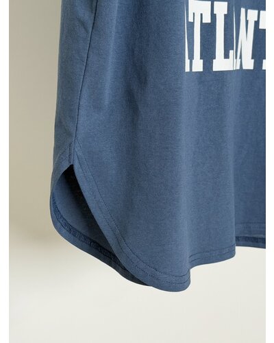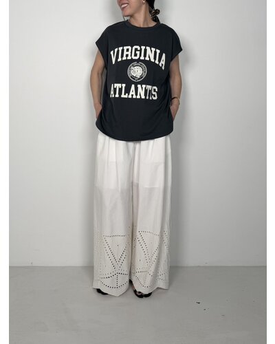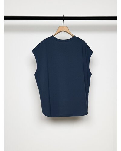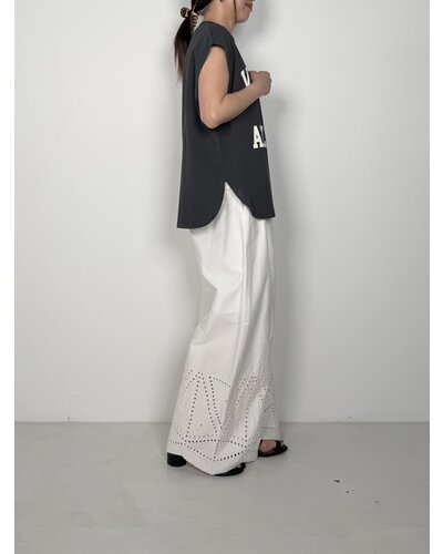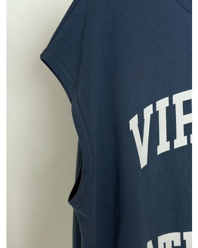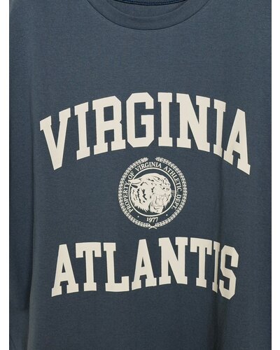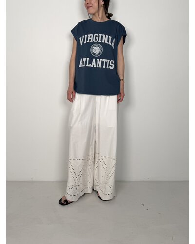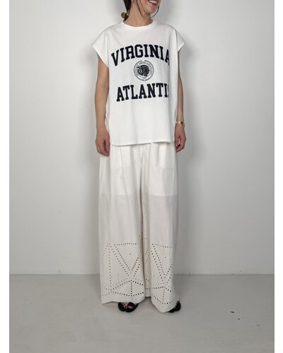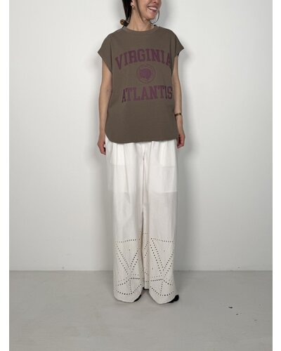カレッジライクなロゴが目を引く、ラフに着られるノースリーブフレンチT。フロントの「VIRGINIA ATLANTIS」=“届きそうで届かない、透明な美しさ”アーチロゴと、ヴィンテージ感のあるエンブレムプリントが程よいアクセントに。 素材は20天竺の厚みがしっかりとあるカジュアルな生地をセレクトし、肩まわりは少し落ちたフレンチシルエットで、抜け感のある印象に。二の腕をすっきり見せつつ、ラフすぎないバランスが◎ 身幅はゆったりめで、風通しもよく夏場でも快適に着られます。 裾はややラウンド気味で、アウトスタイルでもサマになるデザイン。パンツでもスカートでも合わせやすく、デイリーに使いやすい一枚です。