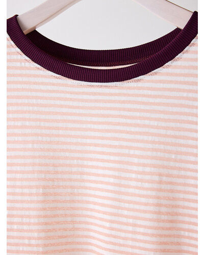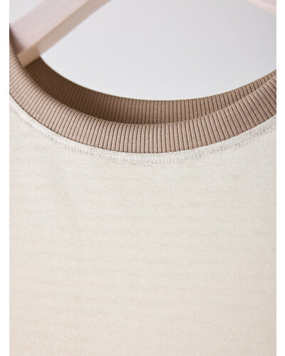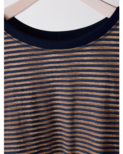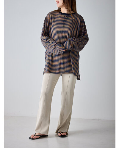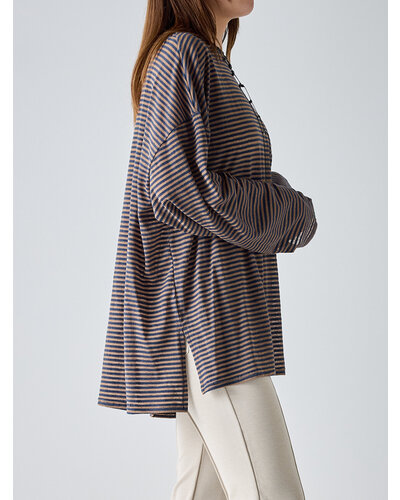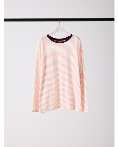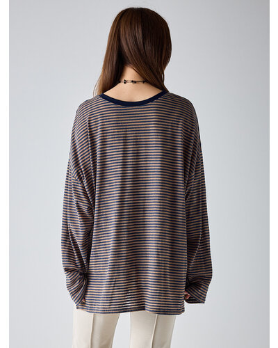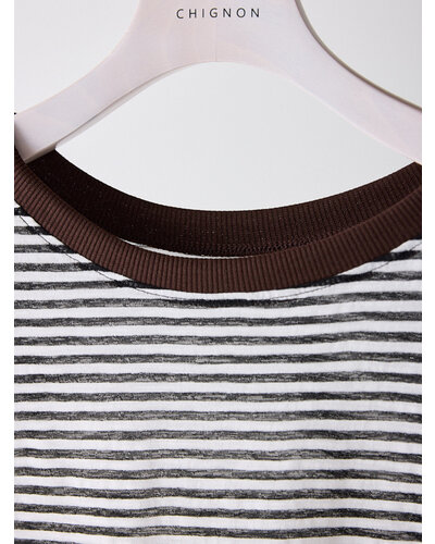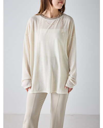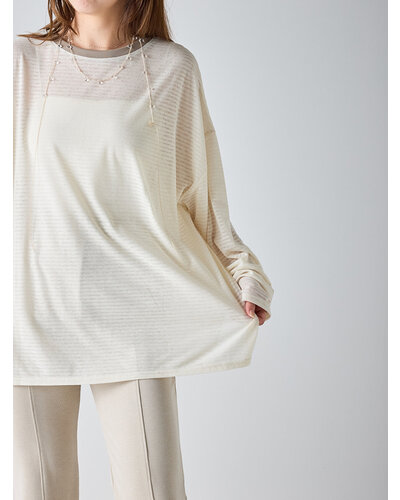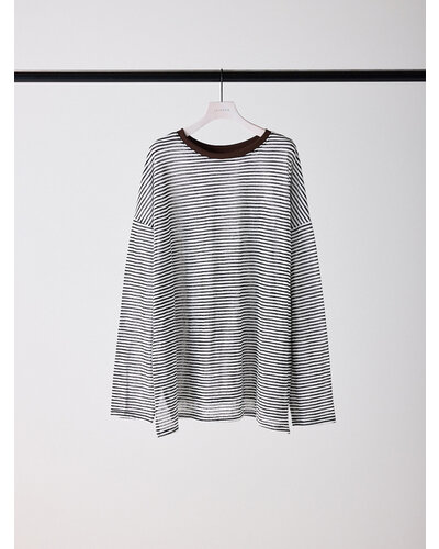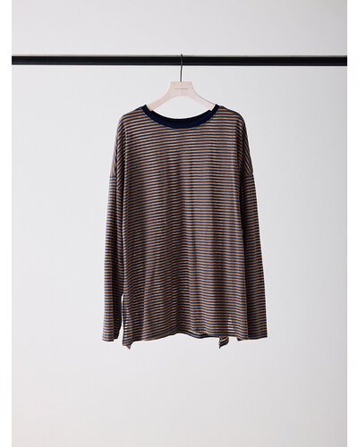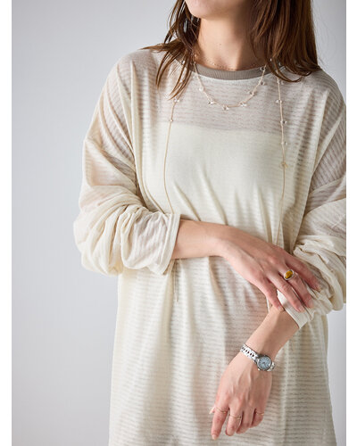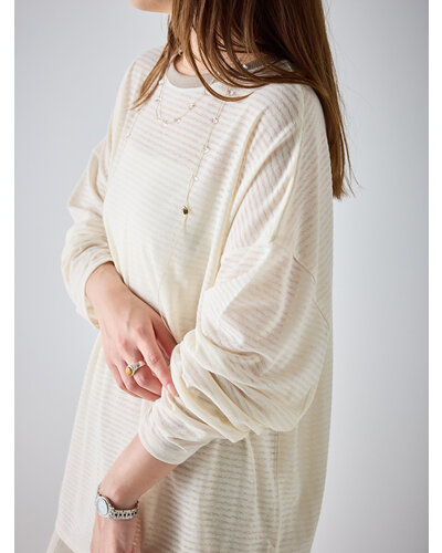 ご好評を頂いておりましたシアーボーダーカットソーから秋を意識した新色がでました。 季節の変わり目にちょうどいい、着回し力の高い1枚。ほんのり透けるシアー素材がシンプルなボーダーに女性らしいニュアンスをプラス。カジュアルすぎず、どこか繊細で大人っぽい印象に仕上がってます。 デニムやスラックスはもちろん、タイトスカートやレイヤードスタイルにも相性◎