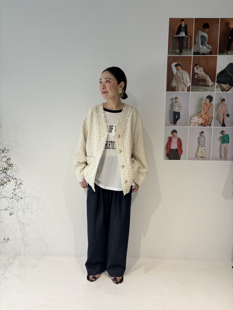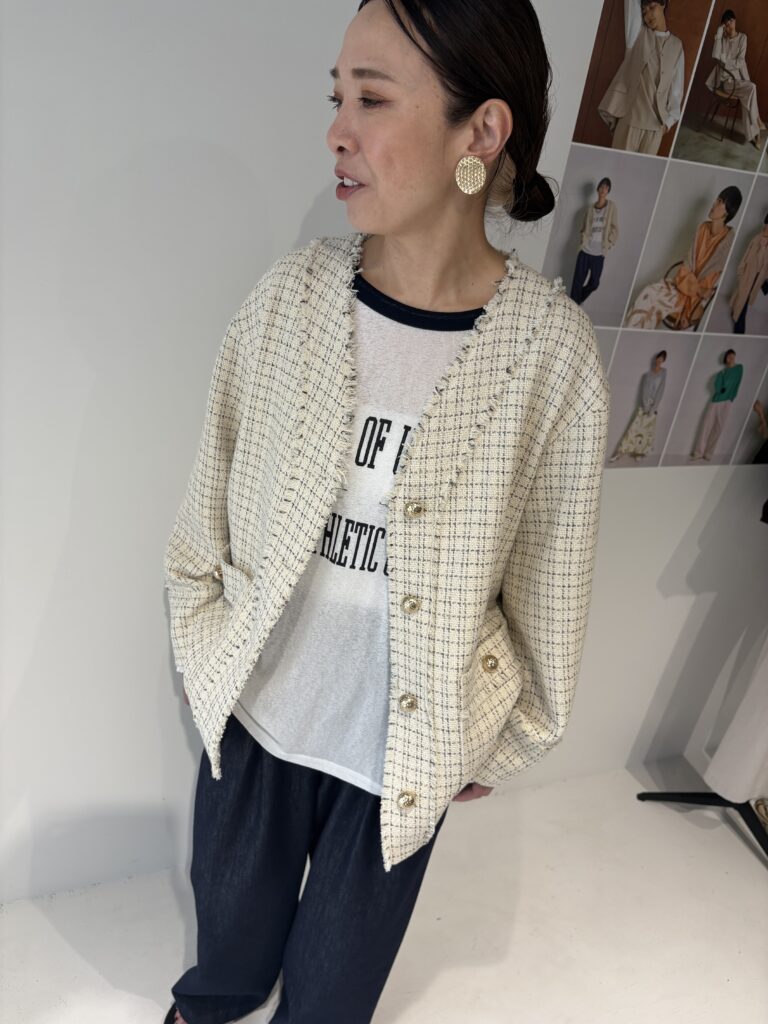 ノーカラーのすっきりしたシルエットと金ボタンやフリンジディティールが、顔まわりを明るく見せてくれます。