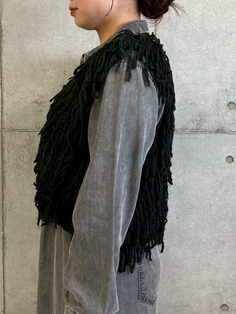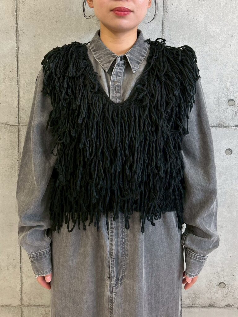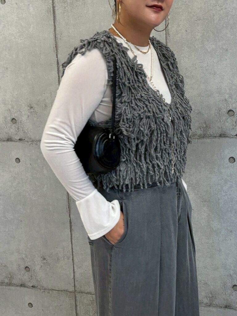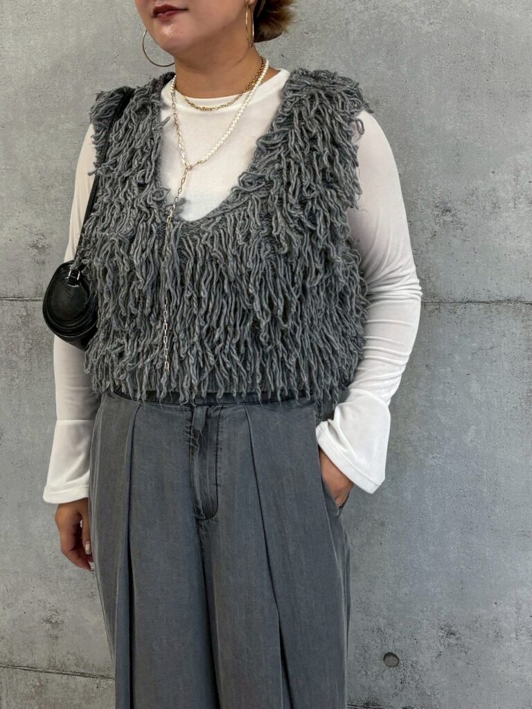 立体感のあるループ編みが特徴的な、存在感たっぷりのデザインベスト。ループ編みがフリンジのように見え、シンプルなコーディネートにプラスするだけでこなれた印象に仕上がります。インナーにはカットソーやシャツはもちろん、ワンピースの上からレイヤードするなど、幅広いスタイリングが楽しめるのも魅力。トレンドのクロップド丈で、ウエスト位置が高く見え、バランスよくスタイルアップ効果も◎。一枚で旬なレイヤードスタイルが完成する、着回し力抜群のアイテムです。