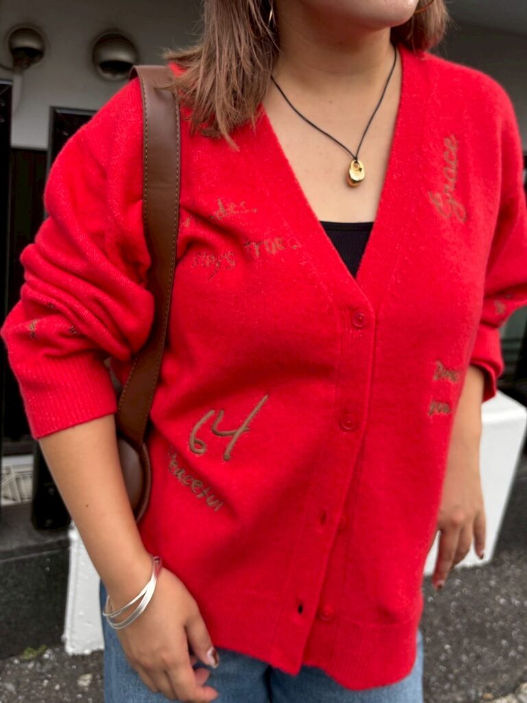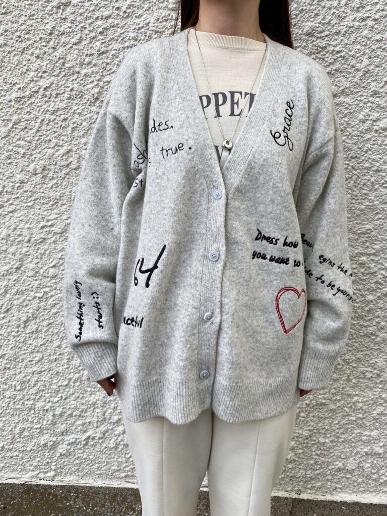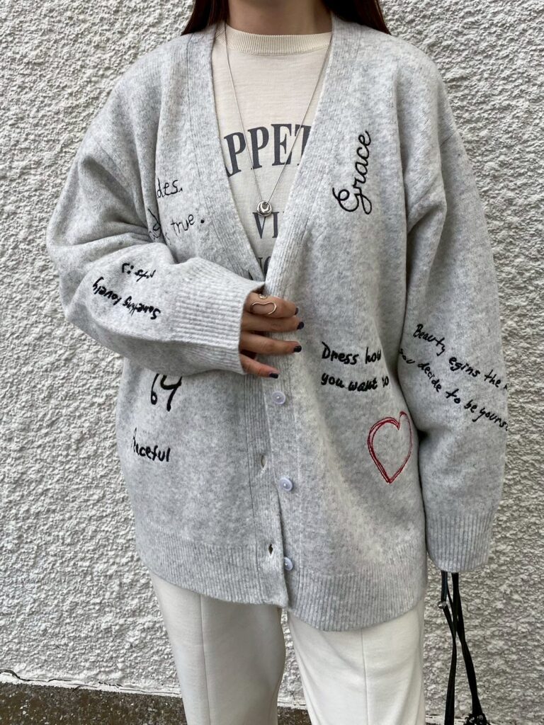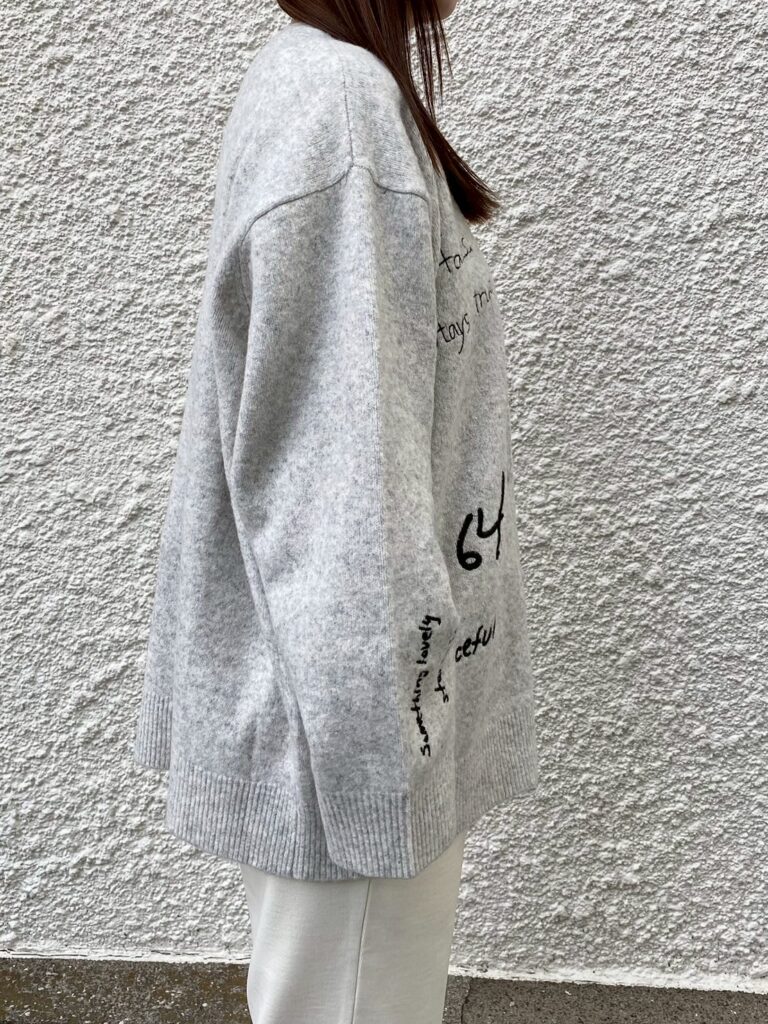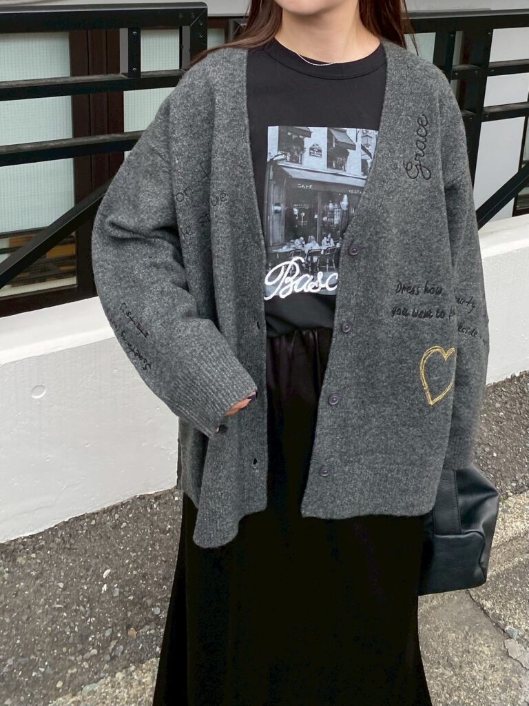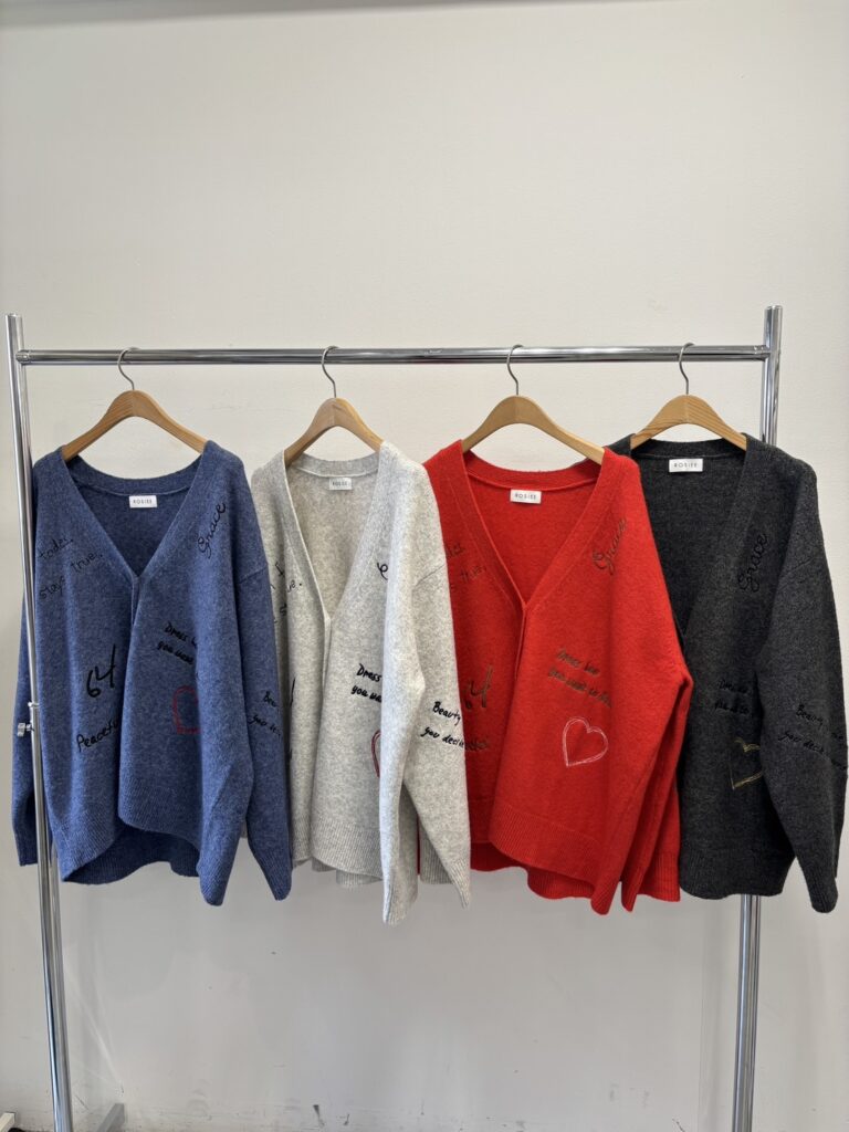 ロゴ刺繍やコード刺繍でたくさんのレタリングをたっぷりと施したニットカーディガンです。素材もROSIEEでは人気の素材で、ふんわり温かみのある表面感が特徴です。