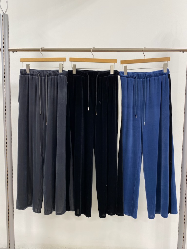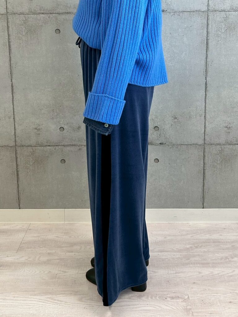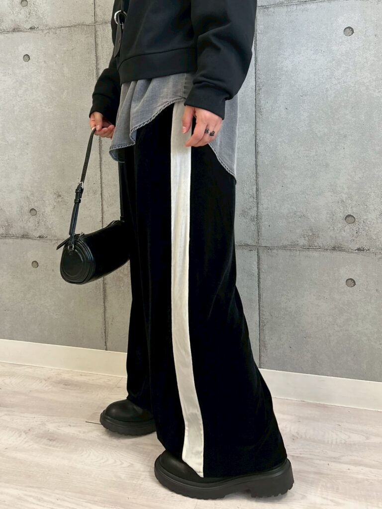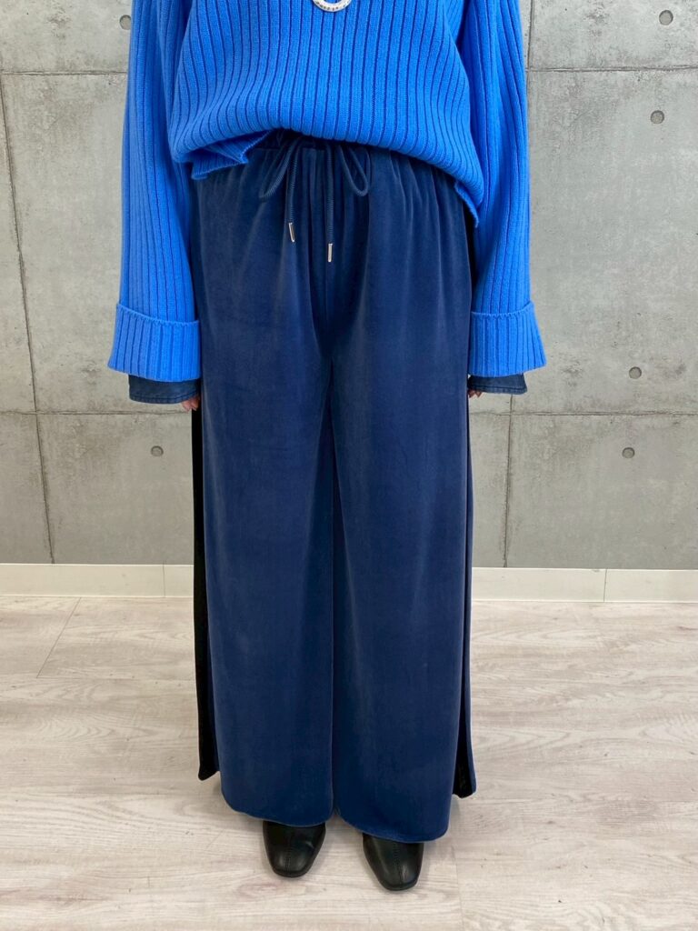 毛足が短くマットな質感のベルベット素材を使用したワイドパンツ。大人っぽく落ち着いた印象で、上品な雰囲気を演出します。ROSIEEらしい配色ラインがアクセントとなり、カラーによってはキレイめにもスポーティーにも着こなせる万能アイテムです。ウエストは靴紐で調節可能で、紐自体もデザインポイントとして映え、細部までこだわりが詰まっています。快適な履き心地とスタイリッシュな見た目を兼ね備え、デイリーからお出かけまで幅広く活躍するパンツです。