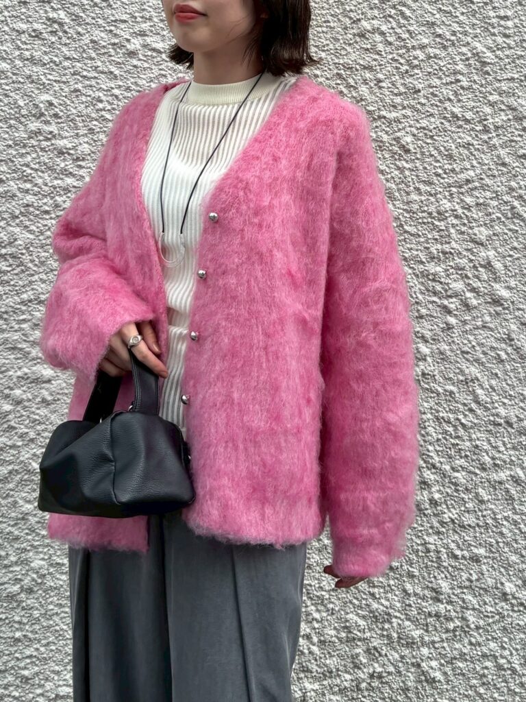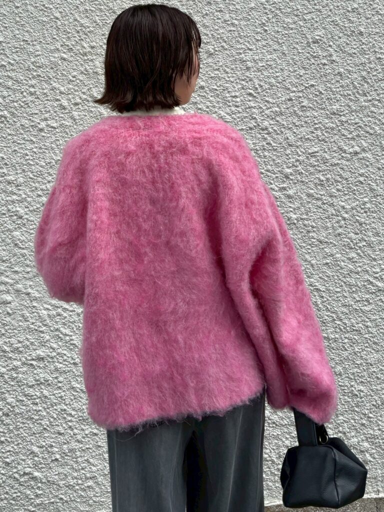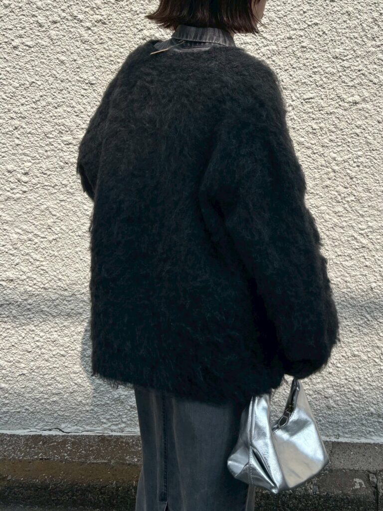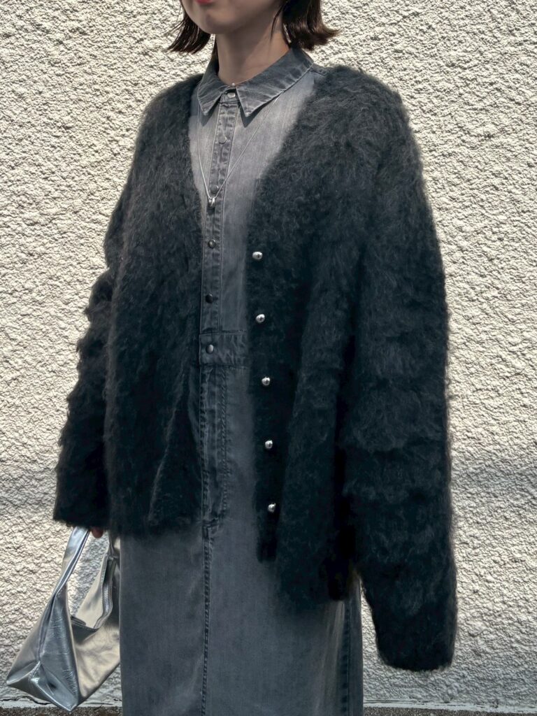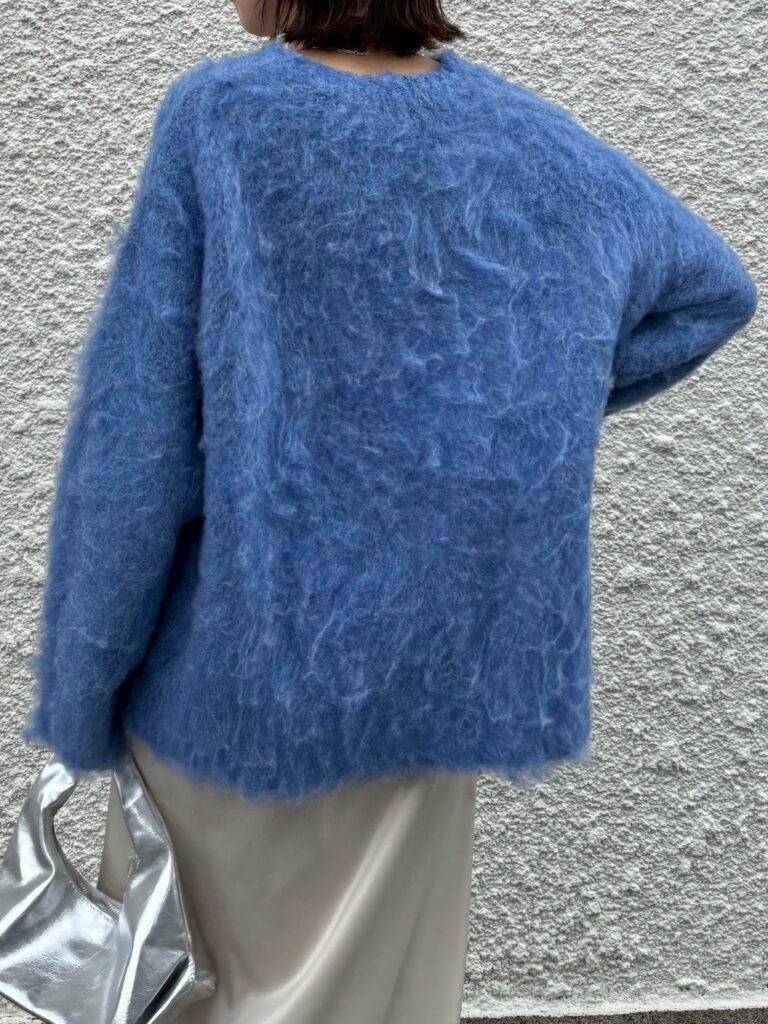 毛足のあるニットをブラッシング加工というものを施し、より温かみとこなれ感をUPさせたニットカーディガンです。シルバー釦なので、スッキリとした印象になり、カジュアルでもキレイ目でもどちらにも振れるデザインです。丈も長すぎず、アウターの中にも着用していただけます。デニムやスラックス、Iラインスカートとのこなれ感のある今季らしいスタイリングがおすすめです。