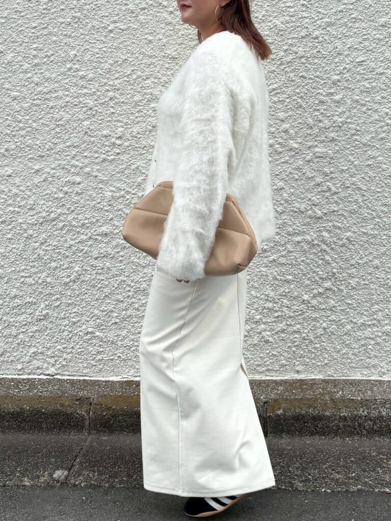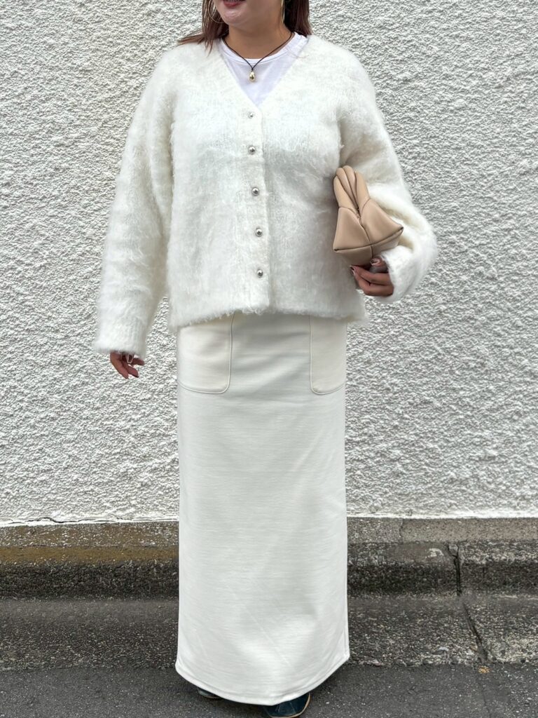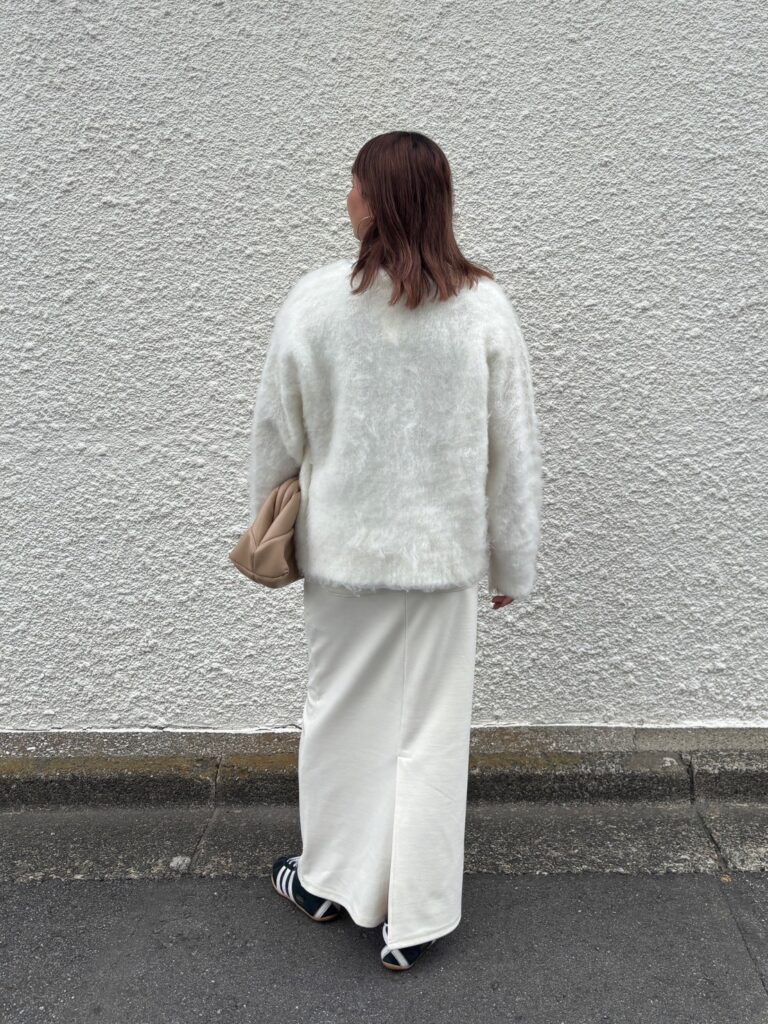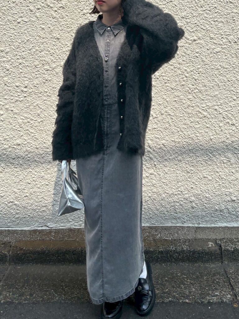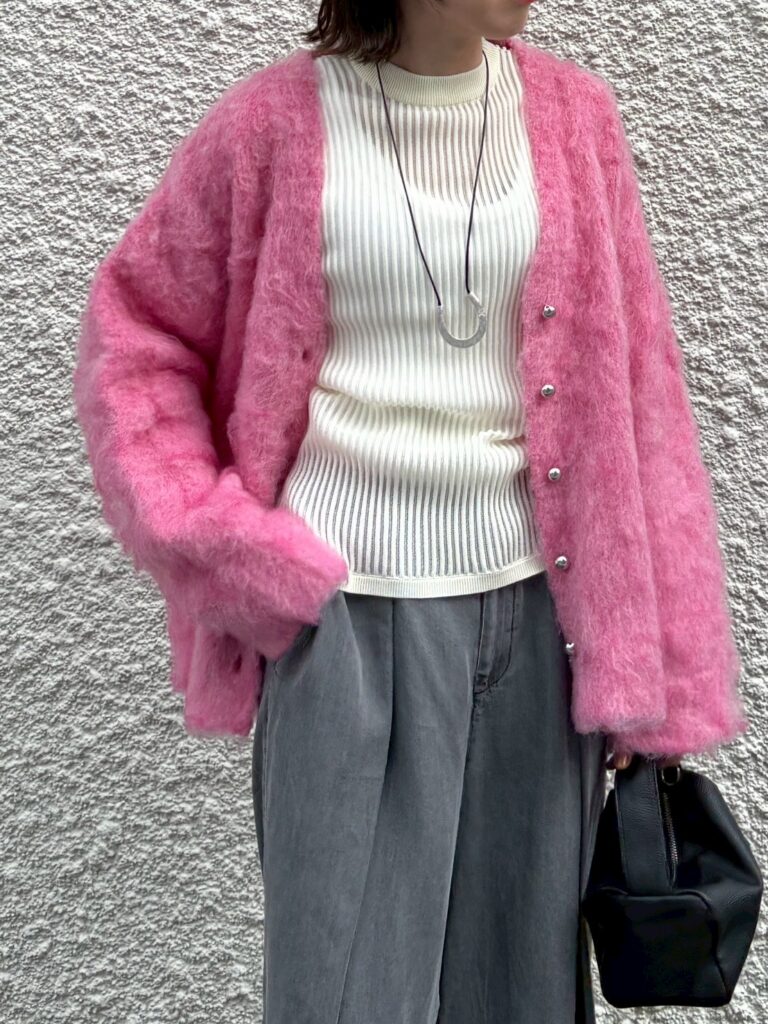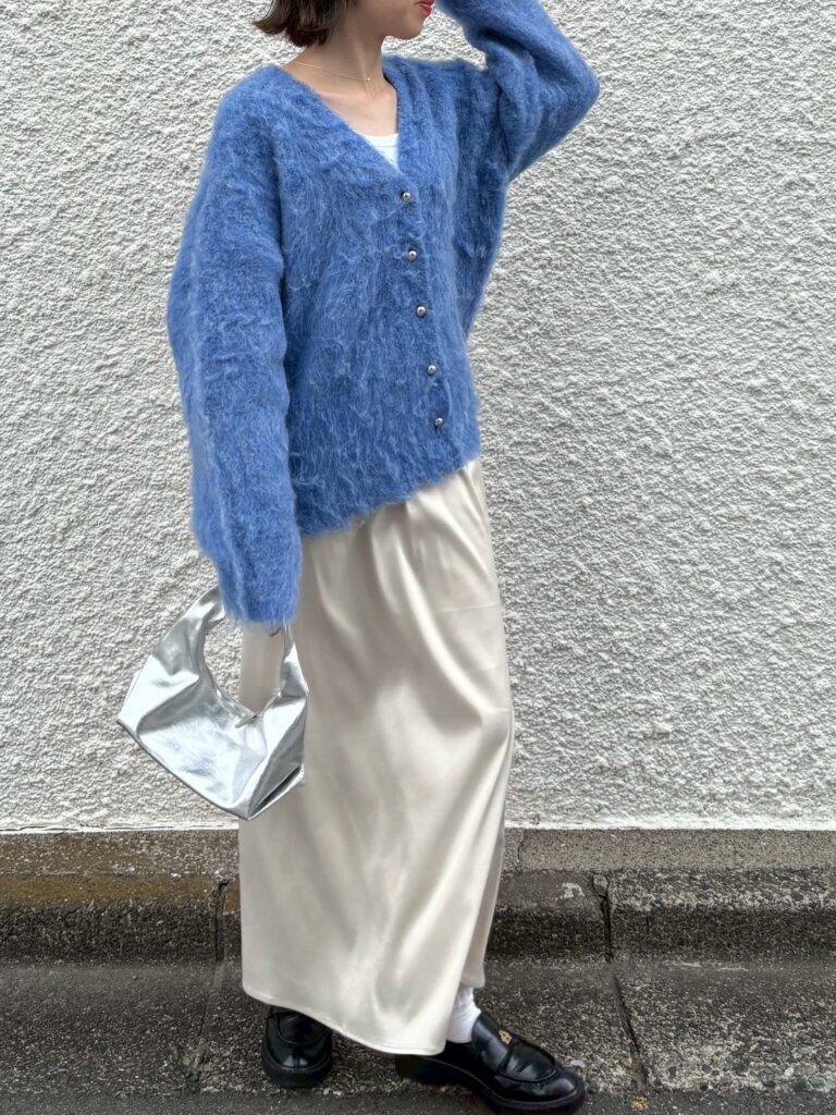 毛足のあるニットをブラッシング加工というものを施し、より温かみとこなれ感をUPさせたニットカーディガンです。シルバー釦なので、スッキリとした印象になり、カジュアルでもキレイ目でもどちらにも振れるデザインです。丈も長すぎず、アウターの中にも着用していただけます。デニムやスラックス、Iラインスカートとのこなれ感のある今季らしいスタイリングがおすすめです。