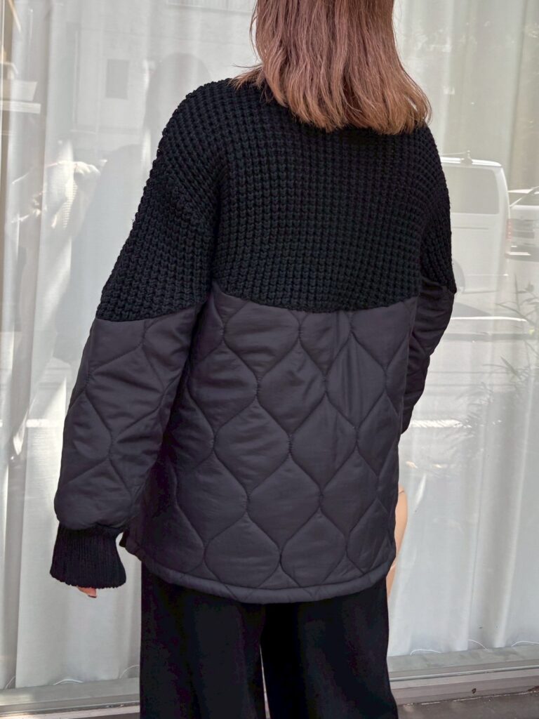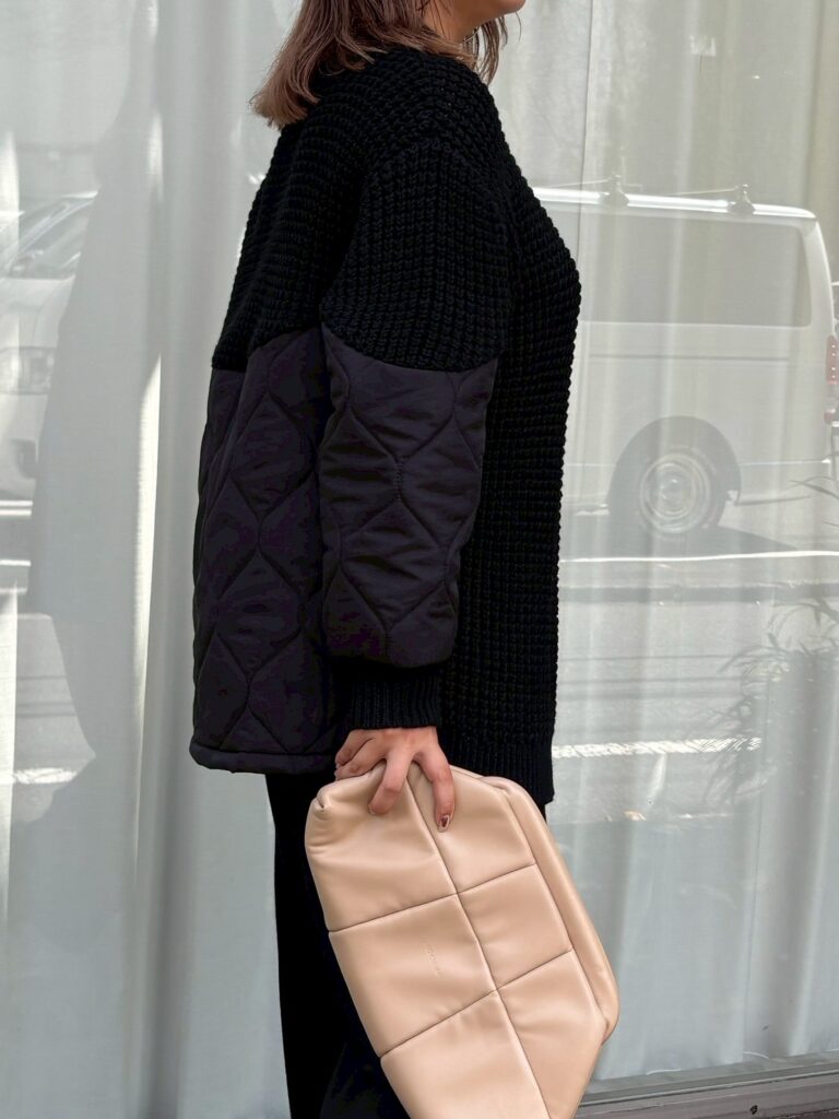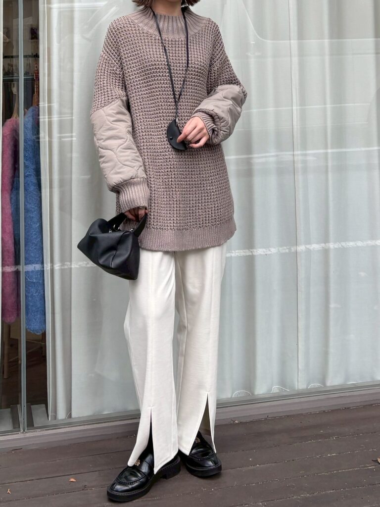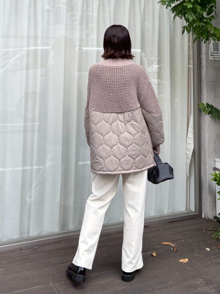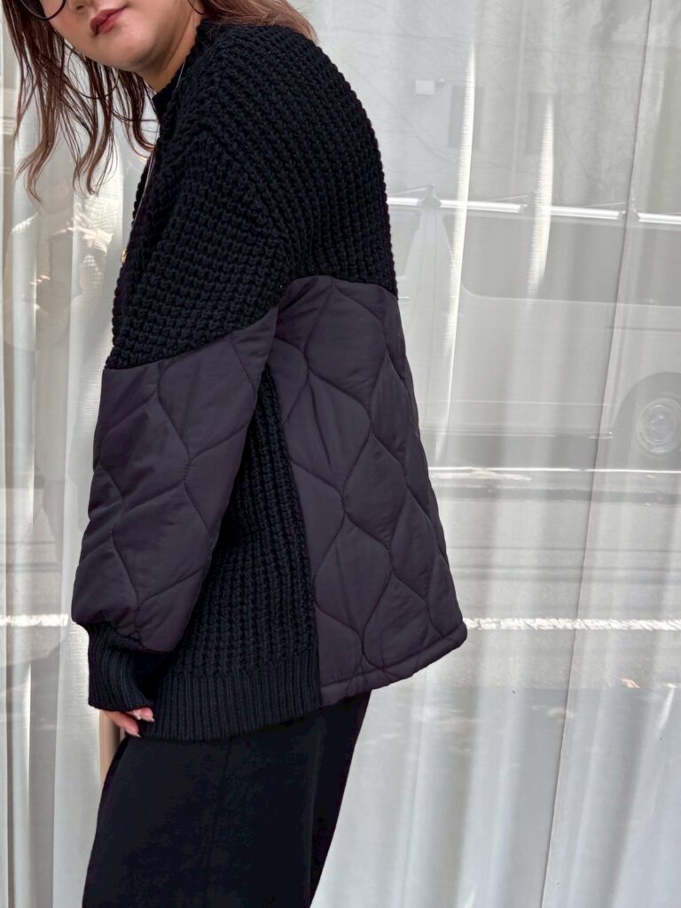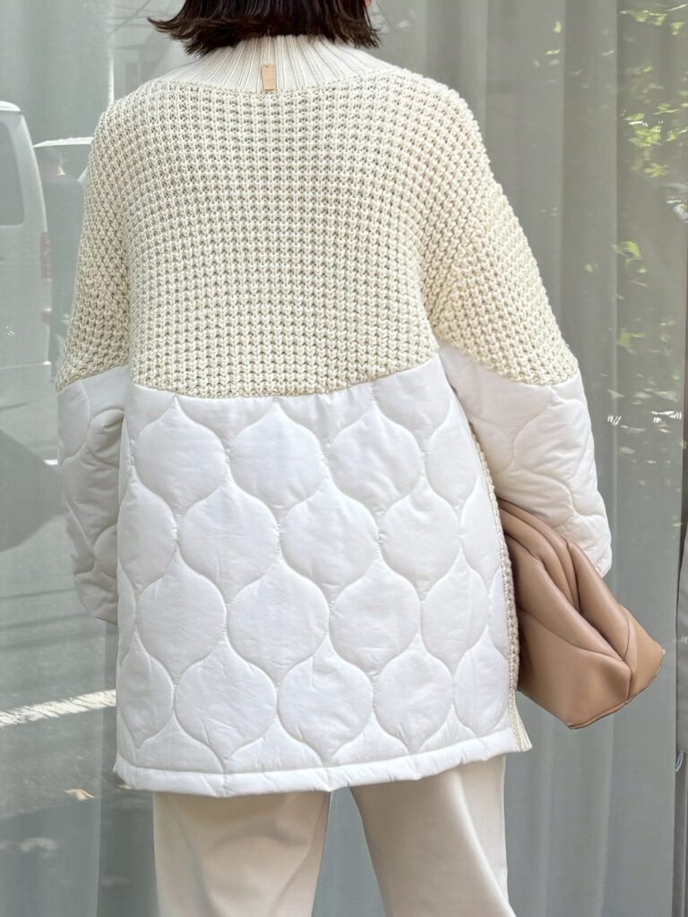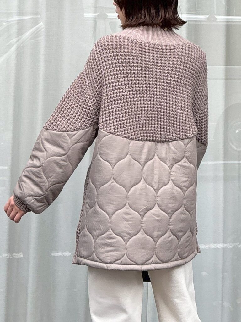 キルティングとニットをドッキングしたデザインニット。ニット地はタック編みという凹凸感のある編地を採用し、キルティング地ともメリハリが出るように拘りました。また、後ろの切り替えは着用時、袖から身頃にかけてラインが繋がるように工夫しました。チュニック丈なので、細身のパンツとあわせてもバランスよくコーディネートの様になる1着です。