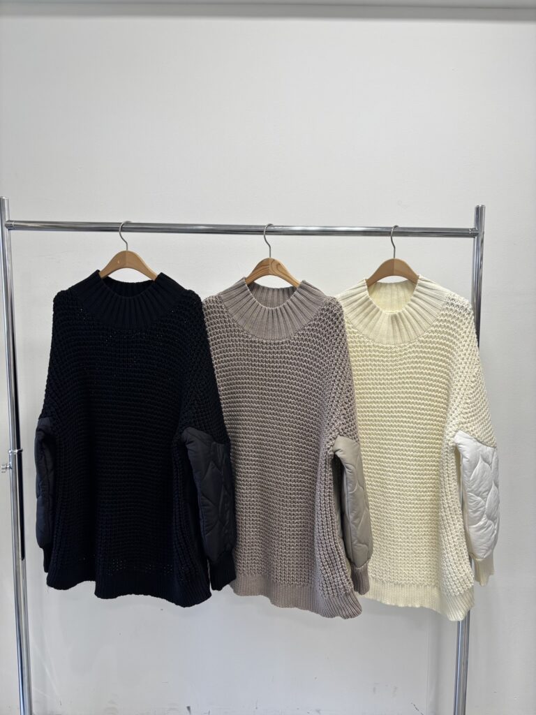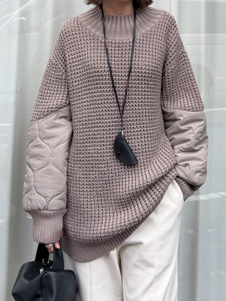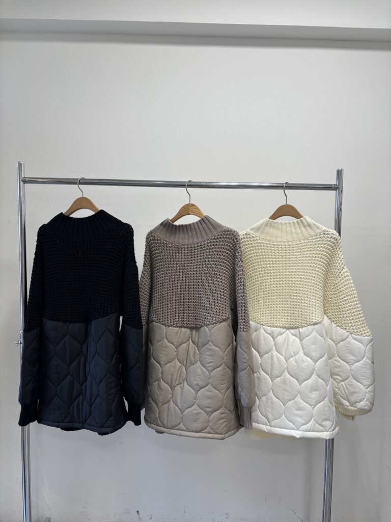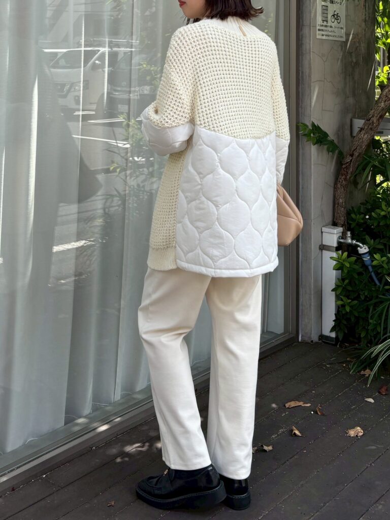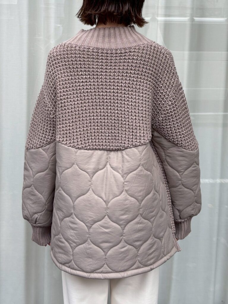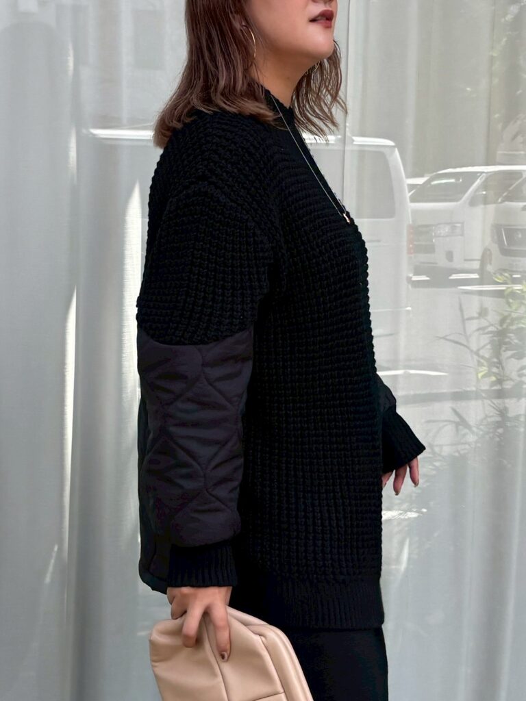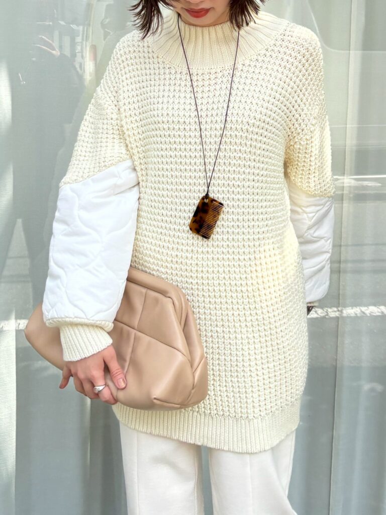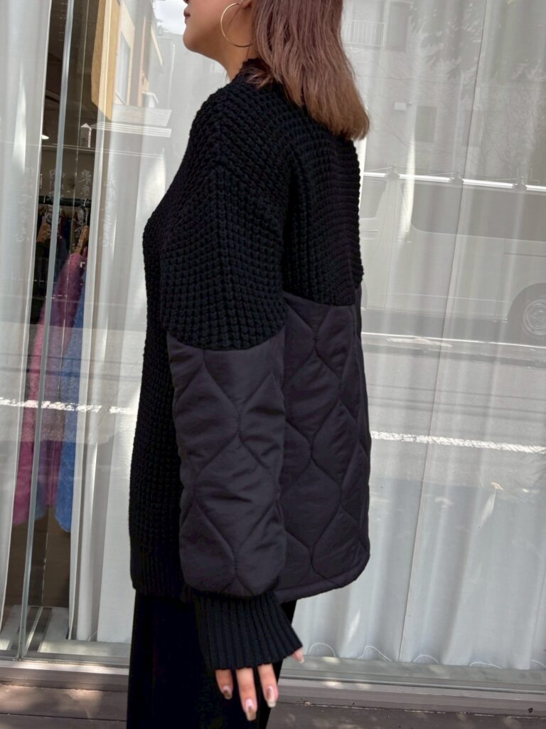 キルティングとニットをドッキングしたデザインニット。ニット地はタック編みという凹凸感のある編地を採用し、キルティング地ともメリハリが出るように拘りました。また、後ろの切り替えは着用時、袖から身頃にかけてラインが繋がるように工夫しました。チュニック丈なので、細身のパンツとあわせてもバランスよくコーディネートの様になる1着です。