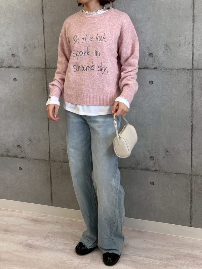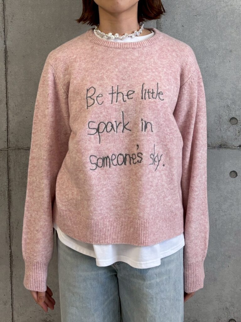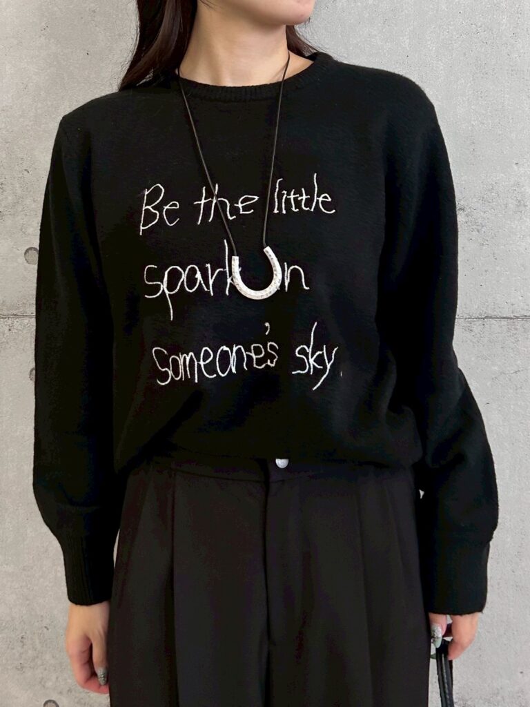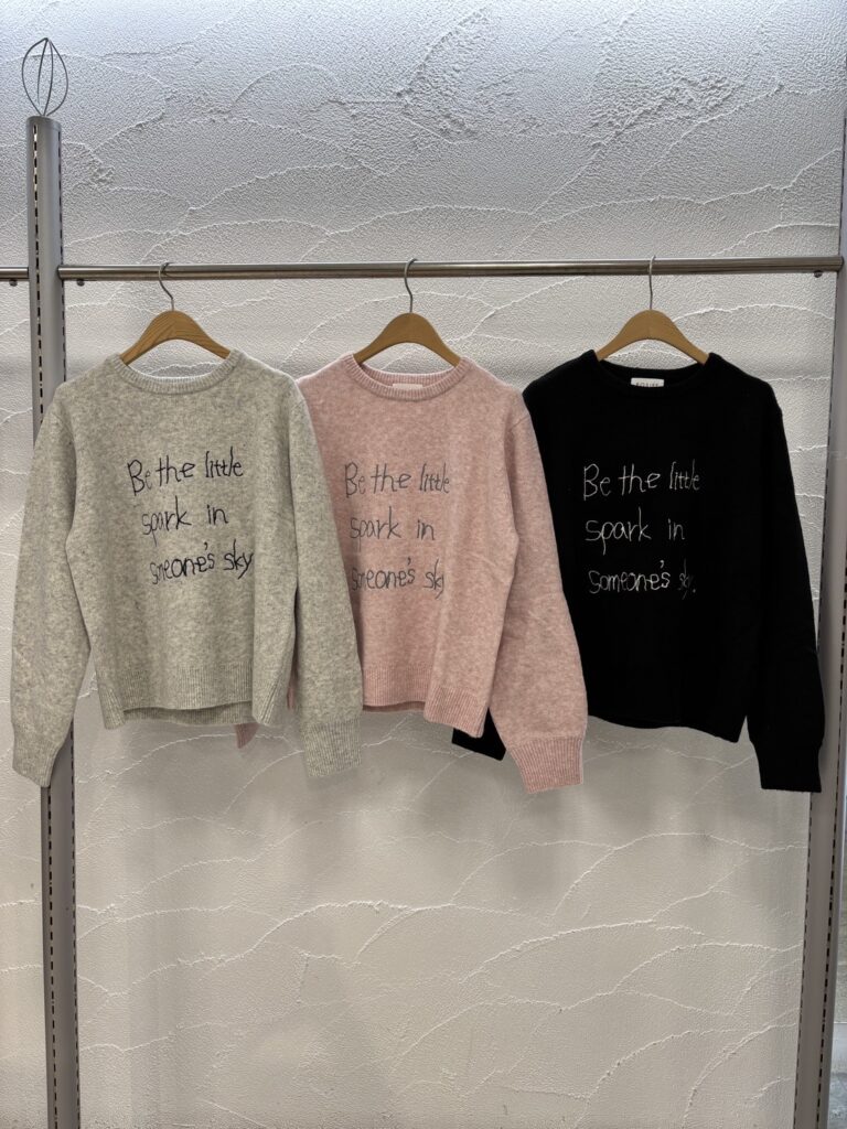 手書き風のロゴを刺繍で施したニットです。ニット素材は温かみのある糸でお作りしています。丈はヒップの半分を隠すほどの丈で、一枚で着用してもキャッチのあるアイテムです。