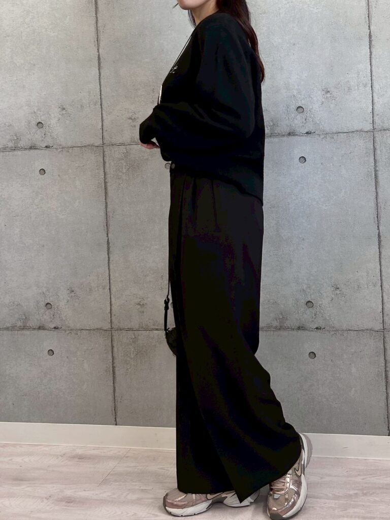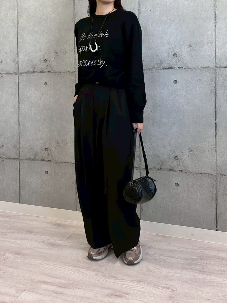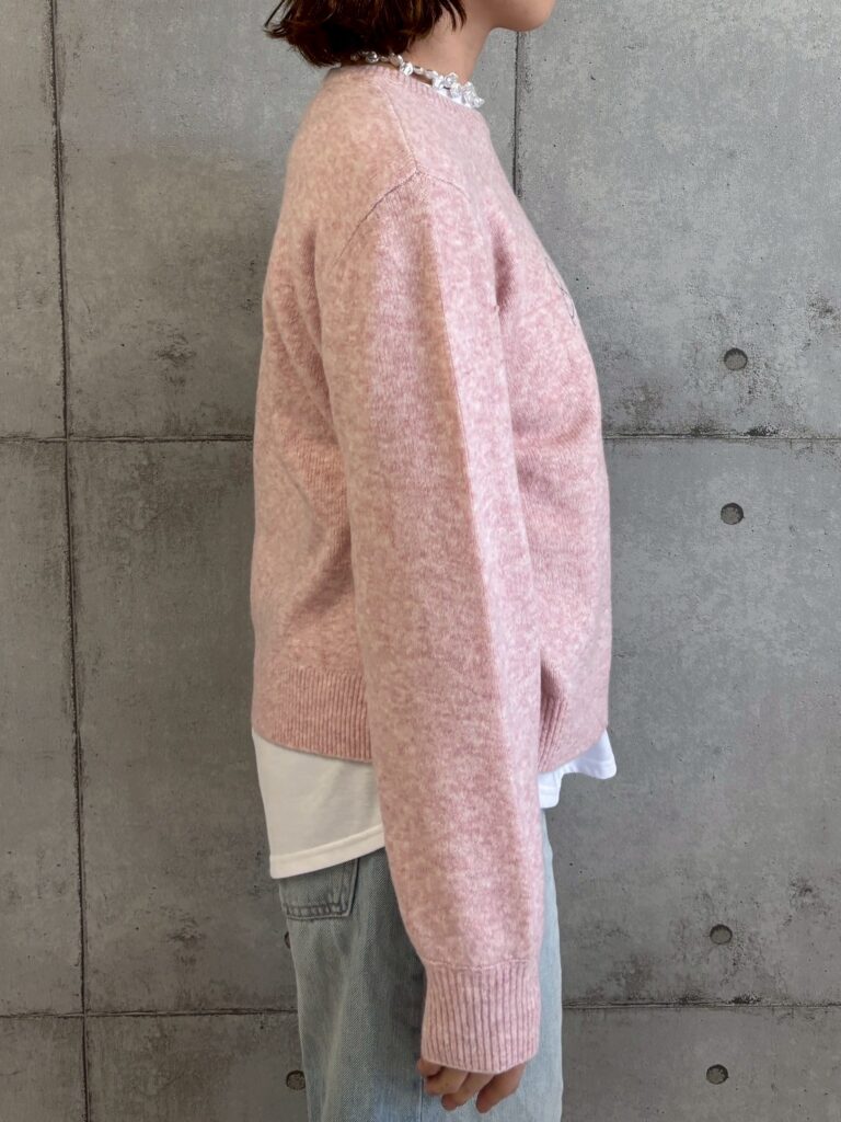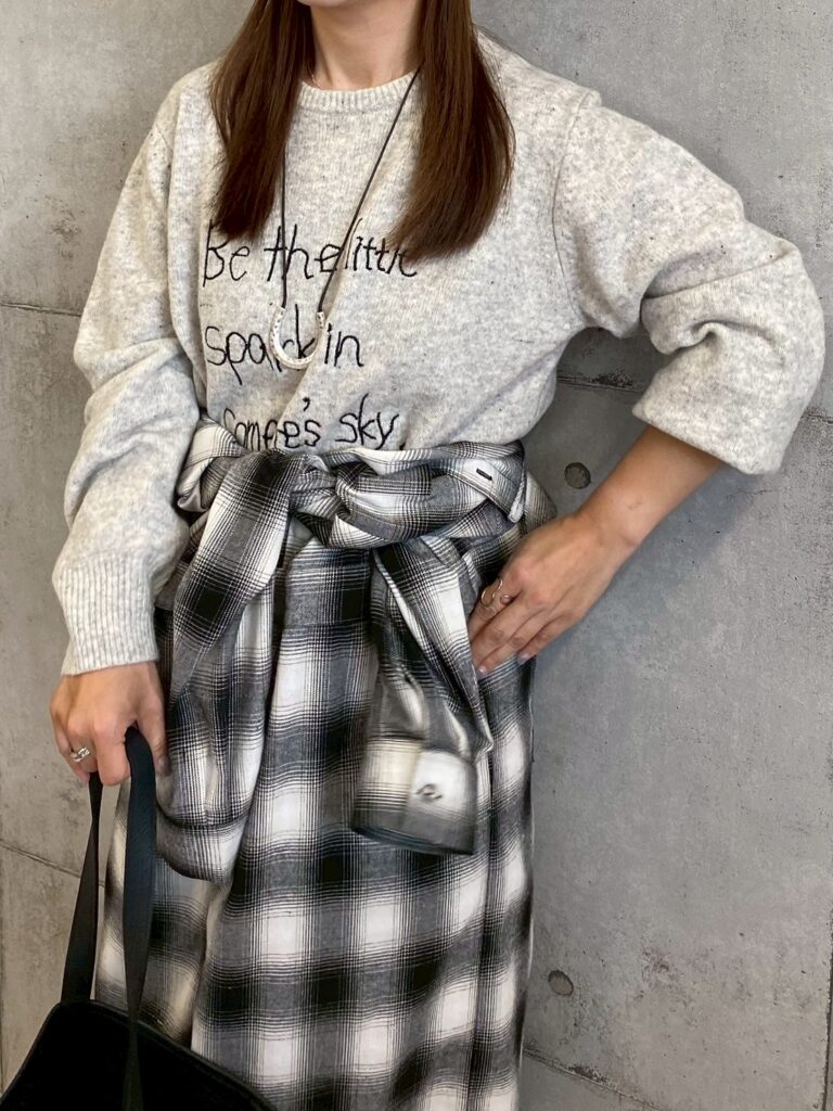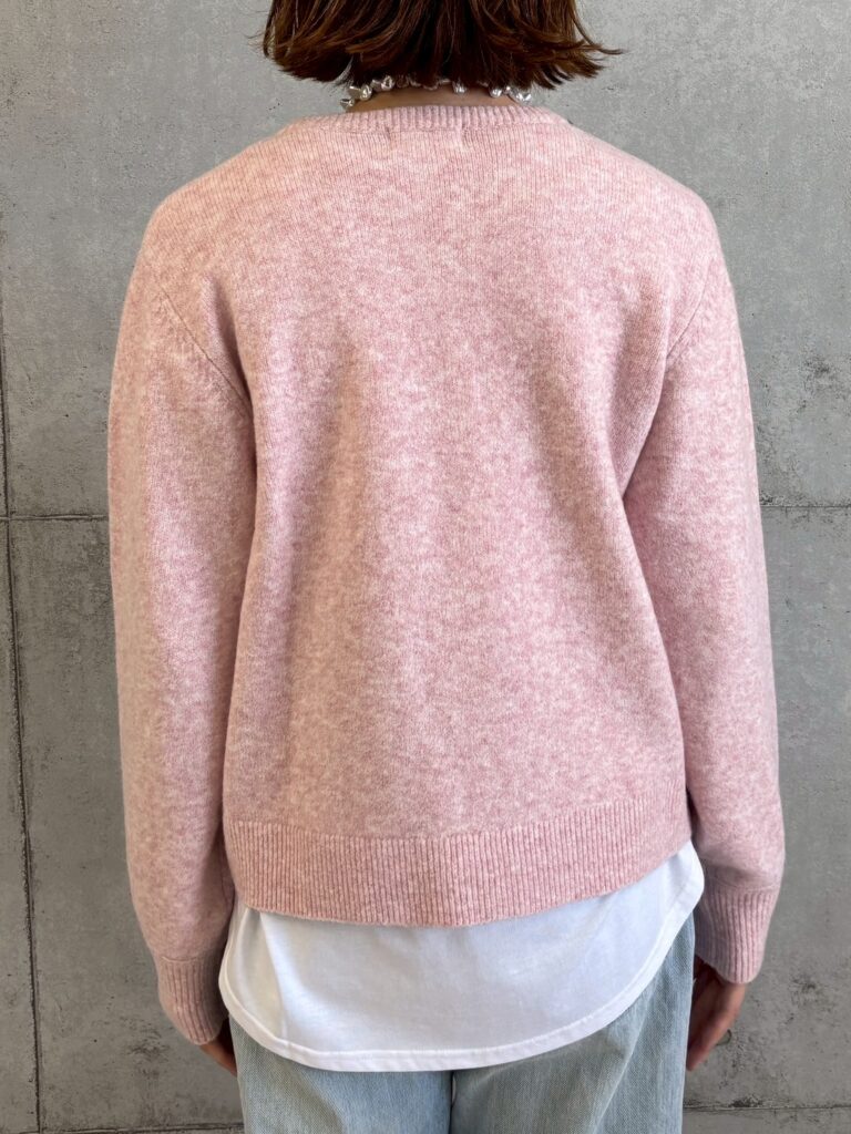手書き風のロゴを刺繍で施したニットです。ニット素材は温かみのある糸でお作りしています。丈はヒップの半分を隠すほどの丈で、一枚で着用してもキャッチのあるアイテムです。