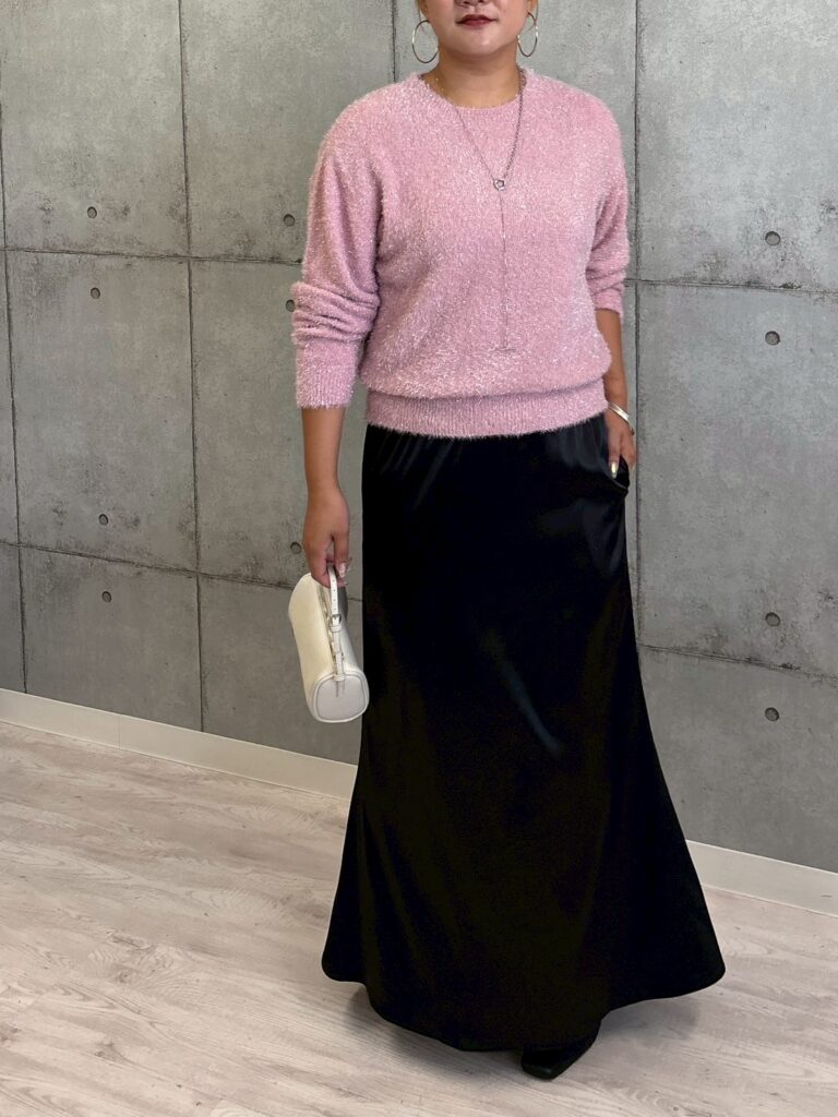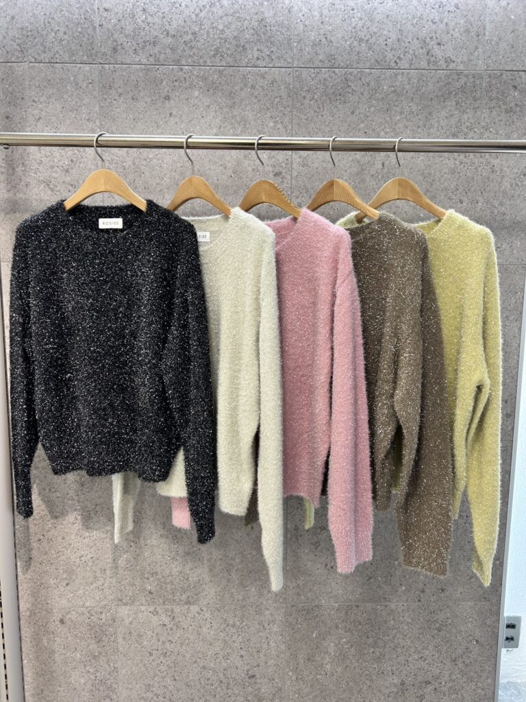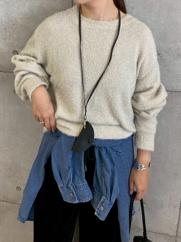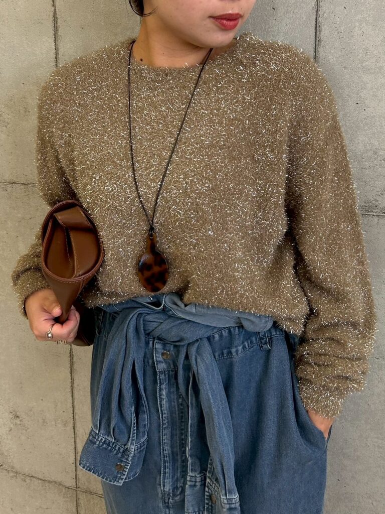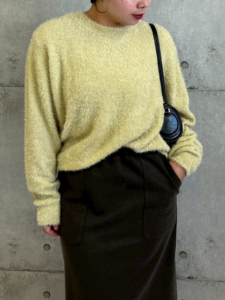 程よい毛足感とラメのきらめきが魅力のシャギー素材を使用した、肌触りふわふわのニット。シンプルなシルエットながら、素材に表情があり、一枚で大人可愛いスタイリングが叶います。カラー展開は、IV・BK・BEのベーシックカラーに加え、コーディネートのアクセントになるPINK・YELLOWの色物もご用意しており、気分やシーンに合わせて選べます。程よい丈感で、スカートにもパンツにもバランスよく合わせやすく、幅広いスタイリングに活躍する一枚です。