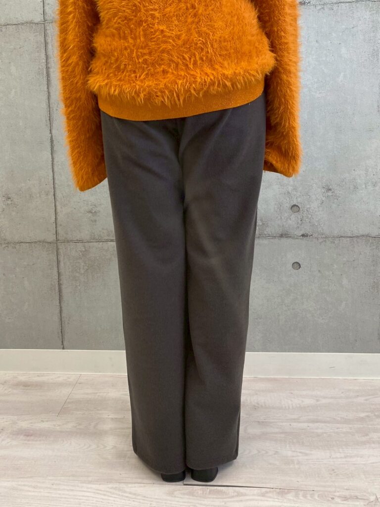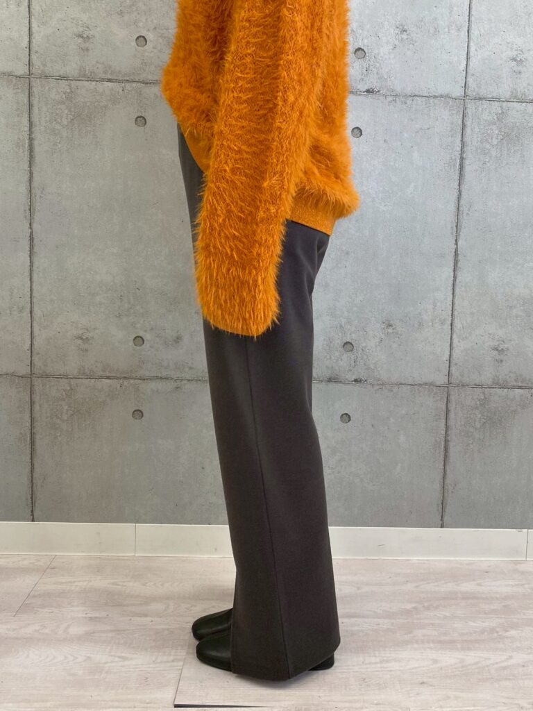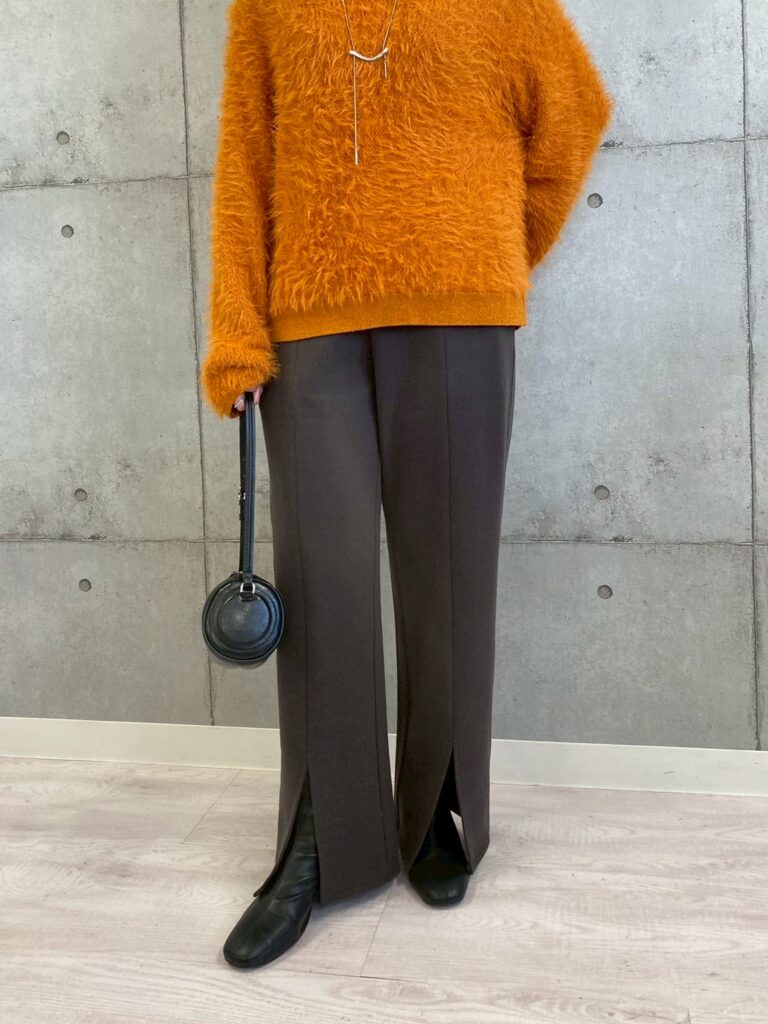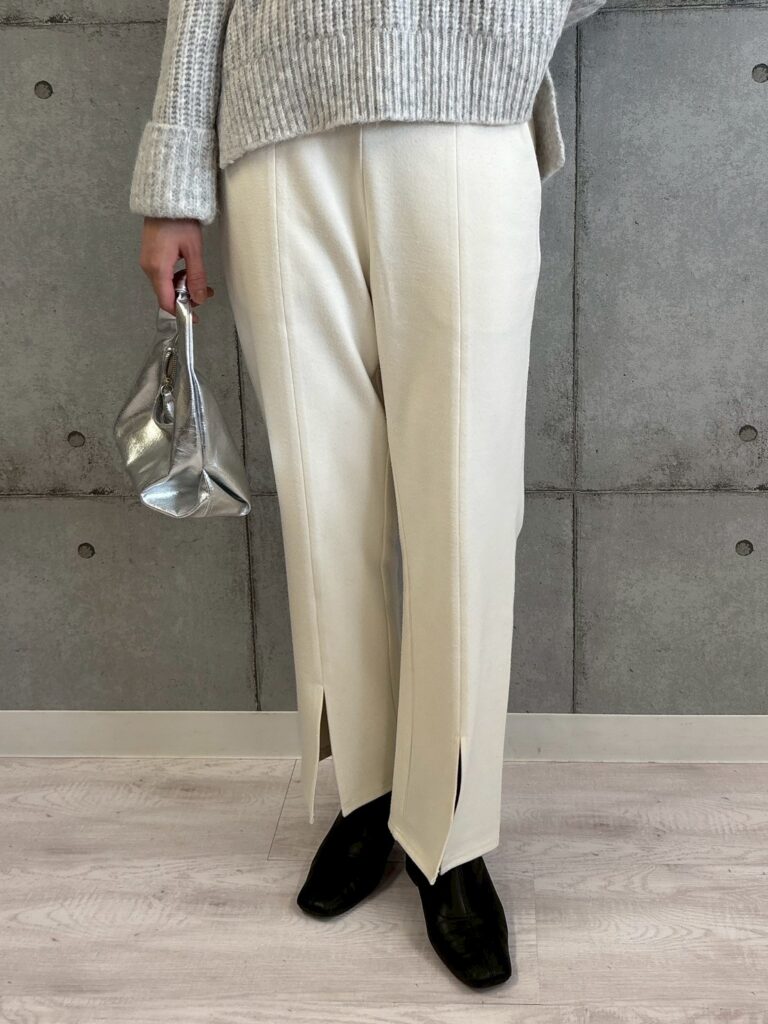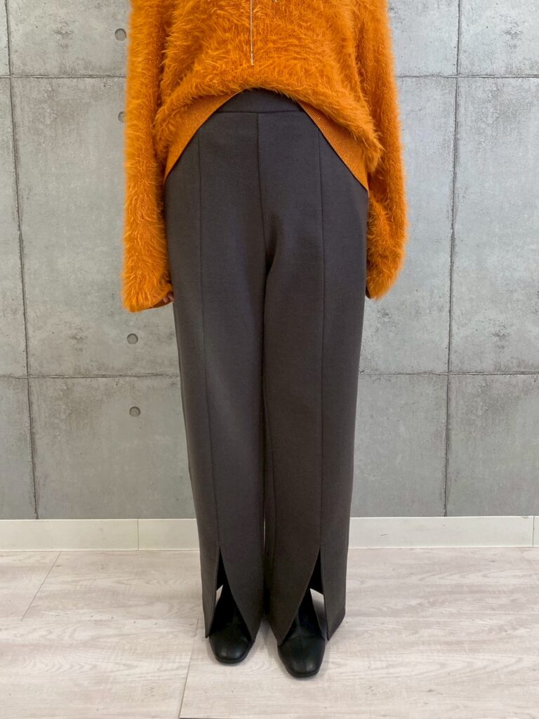 暖かさ抜群の裏起毛素材を使用したパンツは、冬の寒さからしっかりと守ってくれる快適な履き心地が魅力。センターの切り替え線が足を長く、細く見せる美脚効果を発揮し、スタイリッシュなシルエットを叶えます。裾にはセンタースリットを施し、重たくなりがちな冬のコーデに軽やかな抜け感をプラス。ブーツはもちろん、スニーカーとも相性が良く、幅広いシーンで活躍します。防寒とおしゃれを両立させた、冬のマストアイテムです。