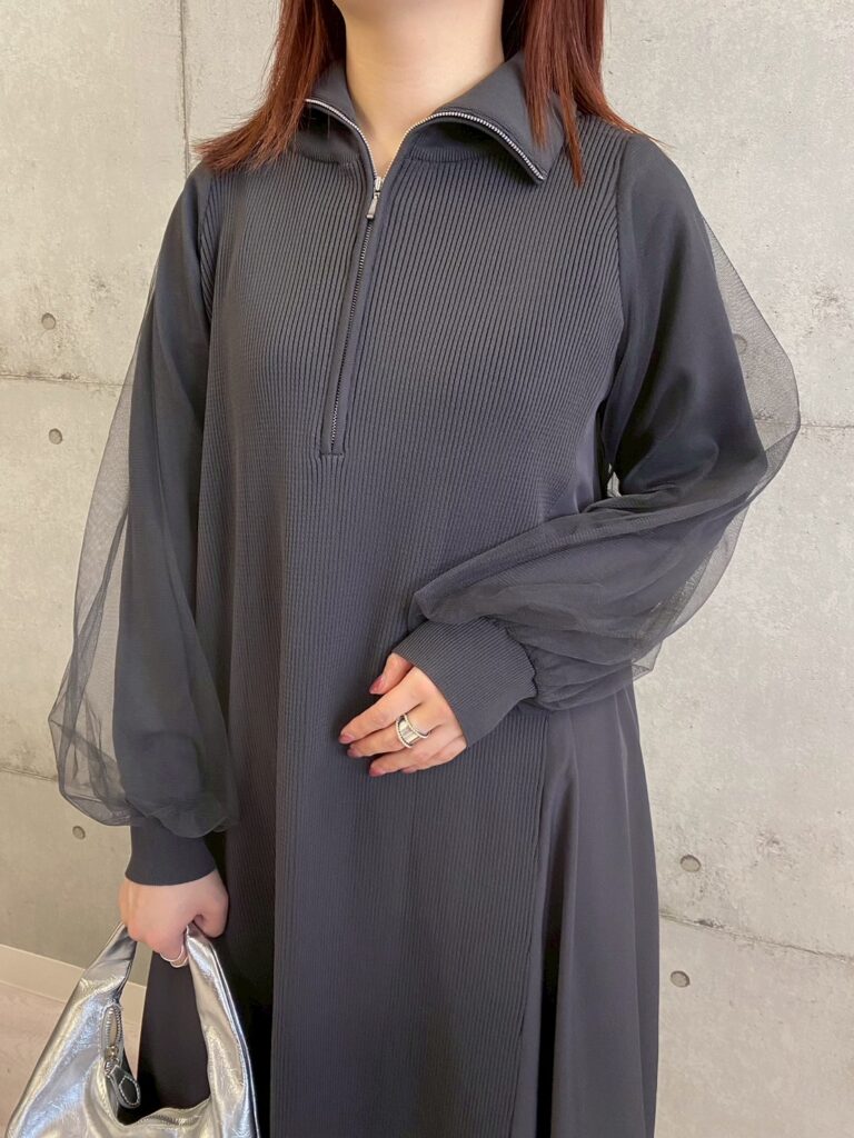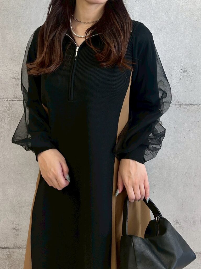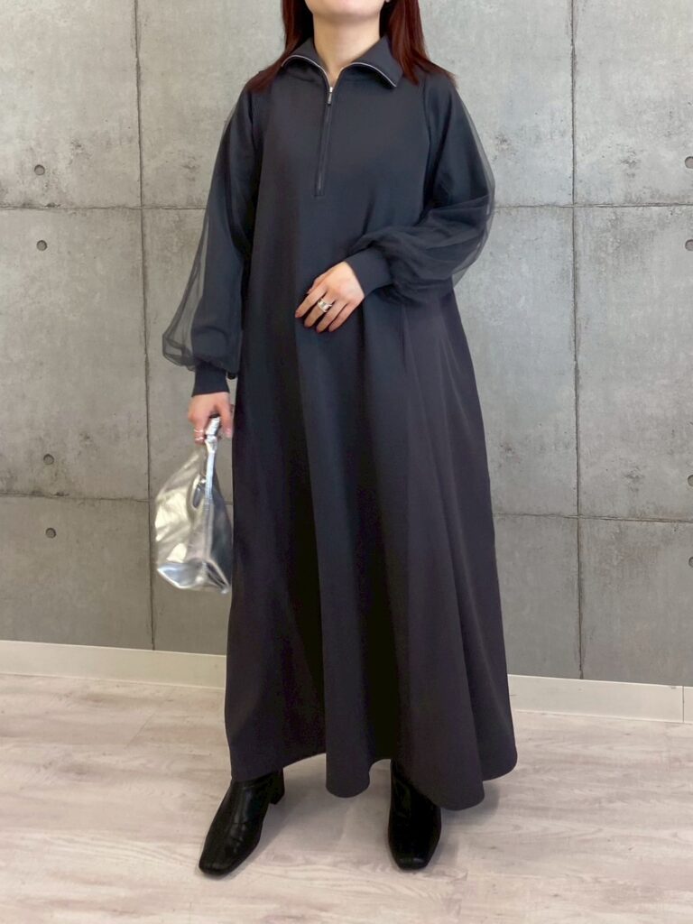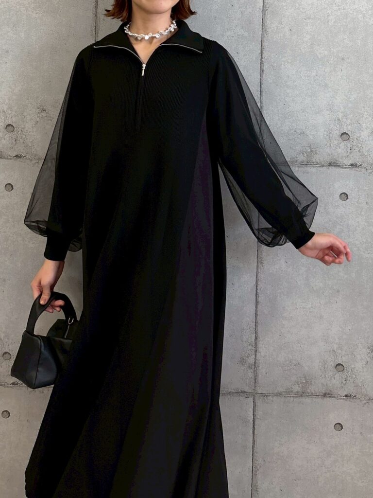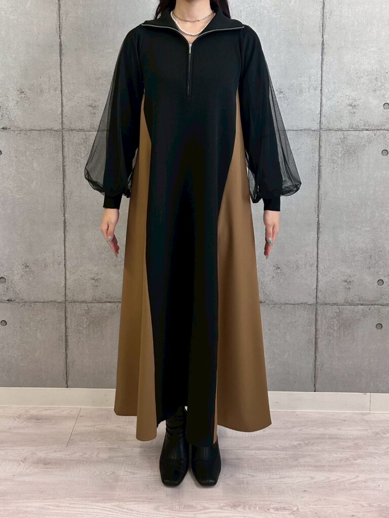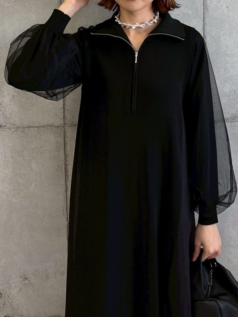 トレンド感のあるハーフジップデザインに、チュールを重ねた袖ディテールが印象的なニットワンピース。スポーティな要素とフェミニンな雰囲気を絶妙にミックスし、大人っぽさと可愛らしさを兼ね備えた一着に仕上げました。すっきりと広がるAラインシルエットが女性らしい印象を演出しつつ、両脇に施されたニットと布帛の切り替えデザインが縦のラインを強調し、細見え効果も◎。体型を自然にカバーしながら、幅広い体型の方にフィットするデザインです。一枚で主役になる存在感ながら、着心地は軽やかで楽ちん。デイリーはもちろん、ちょっとしたお出かけやオンオフ問わず活躍してくれるニットワンピースです。