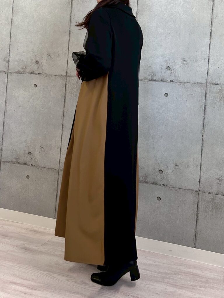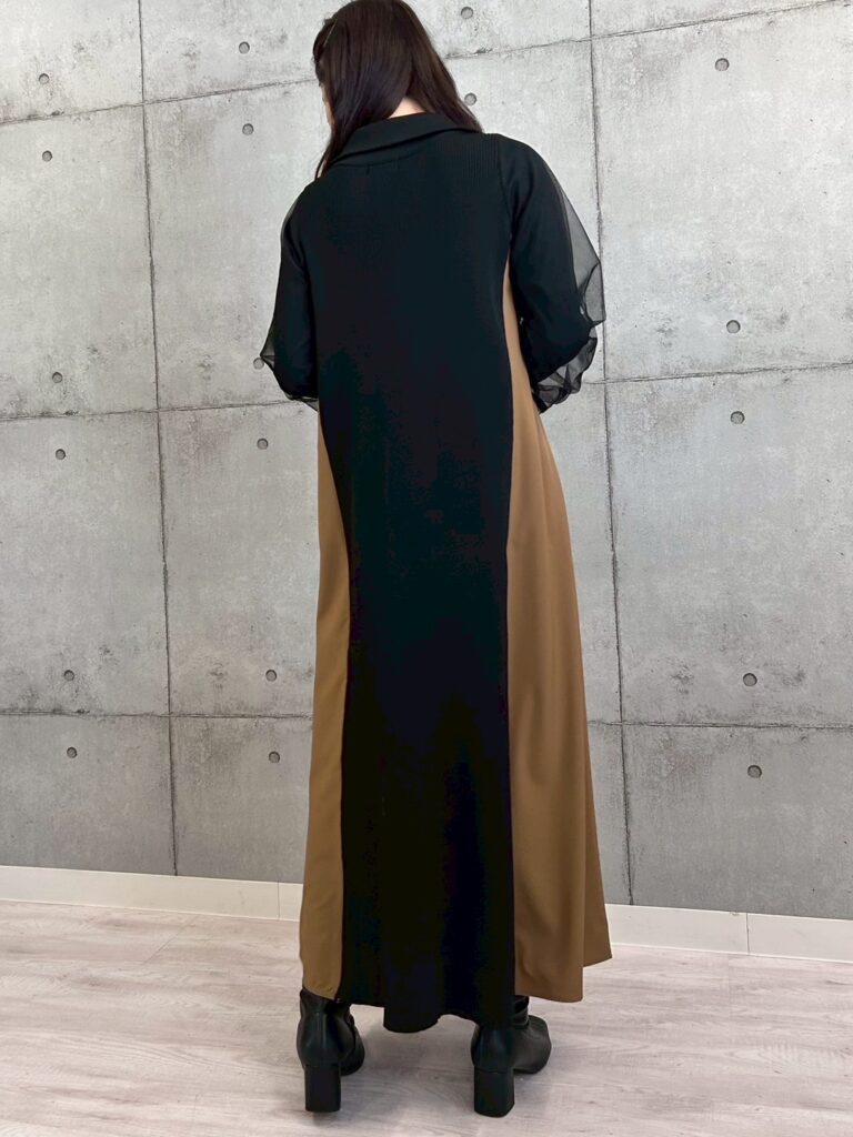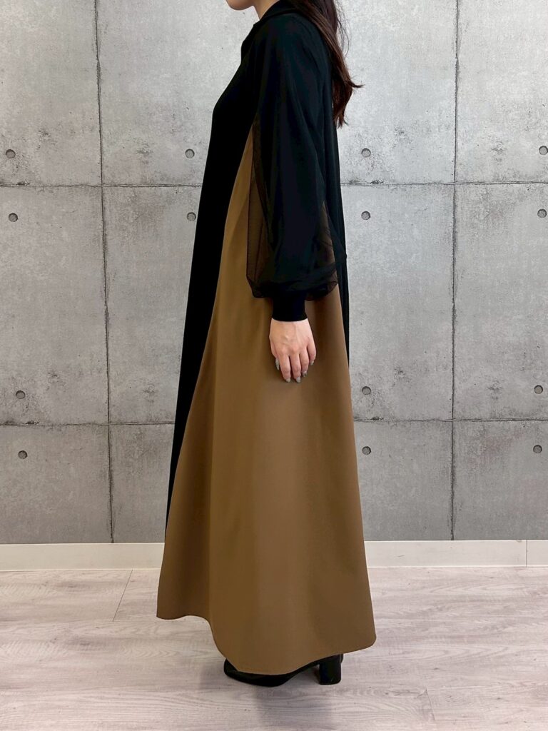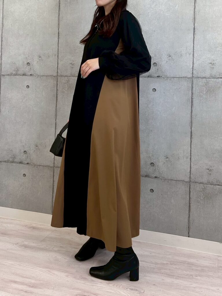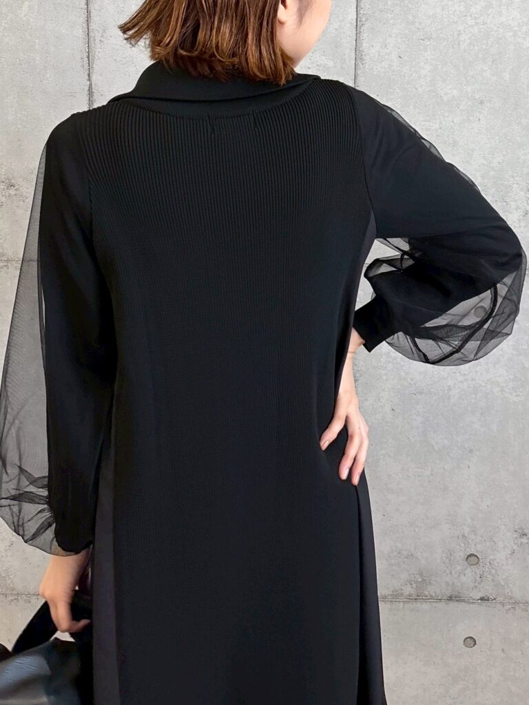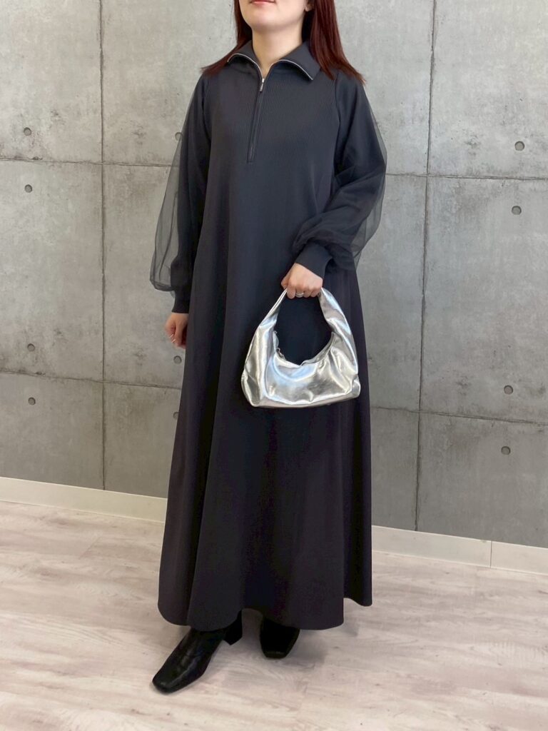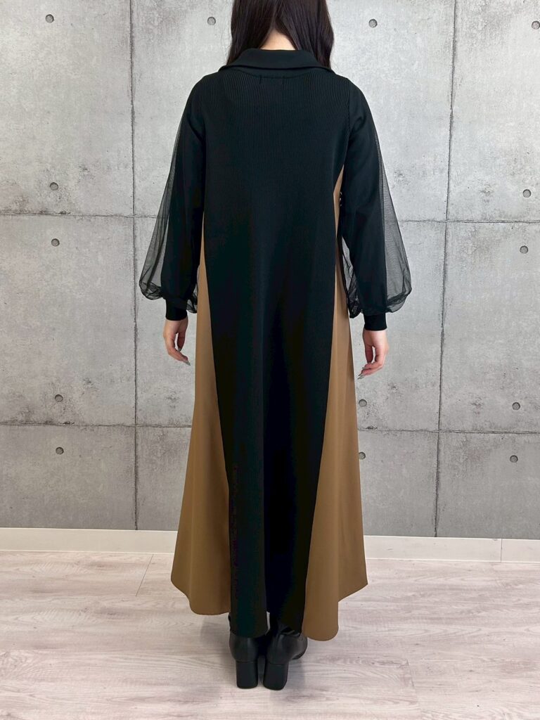 トレンド感のあるハーフジップデザインに、チュールを重ねた袖ディテールが印象的なニットワンピース。スポーティな要素とフェミニンな雰囲気を絶妙にミックスし、大人っぽさと可愛らしさを兼ね備えた一着に仕上げました。すっきりと広がるAラインシルエットが女性らしい印象を演出しつつ、両脇に施されたニットと布帛の切り替えデザインが縦のラインを強調し、細見え効果も◎。体型を自然にカバーしながら、幅広い体型の方にフィットするデザインです。一枚で主役になる存在感ながら、着心地は軽やかで楽ちん。デイリーはもちろん、ちょっとしたお出かけやオンオフ問わず活躍してくれるニットワンピースです。