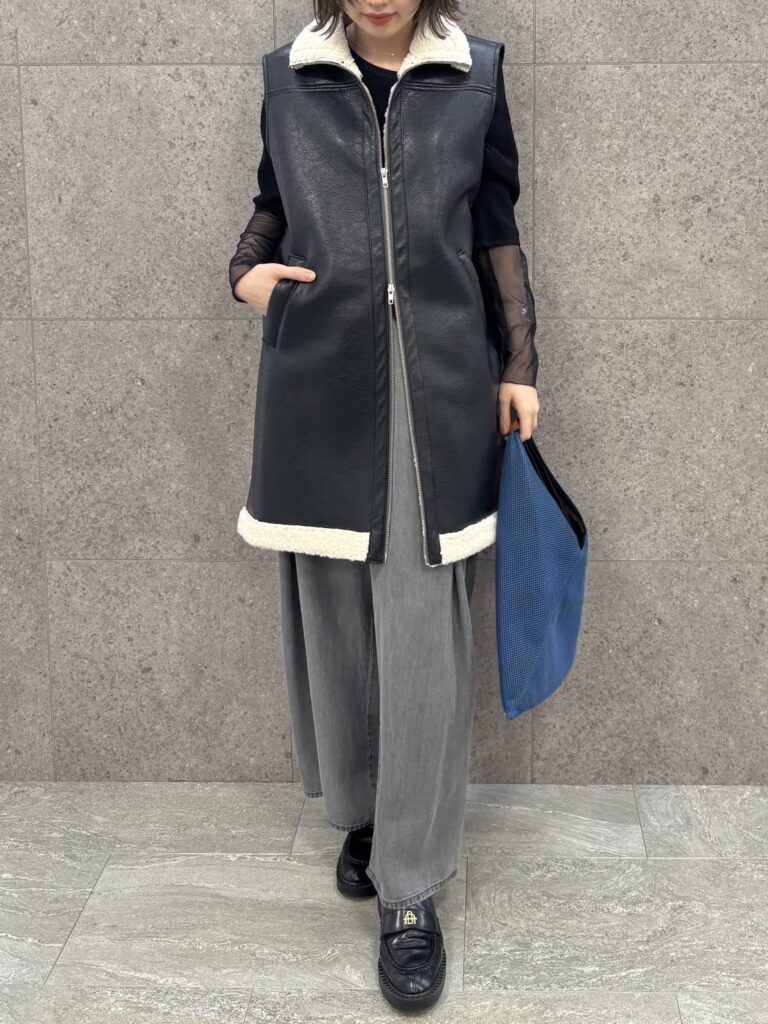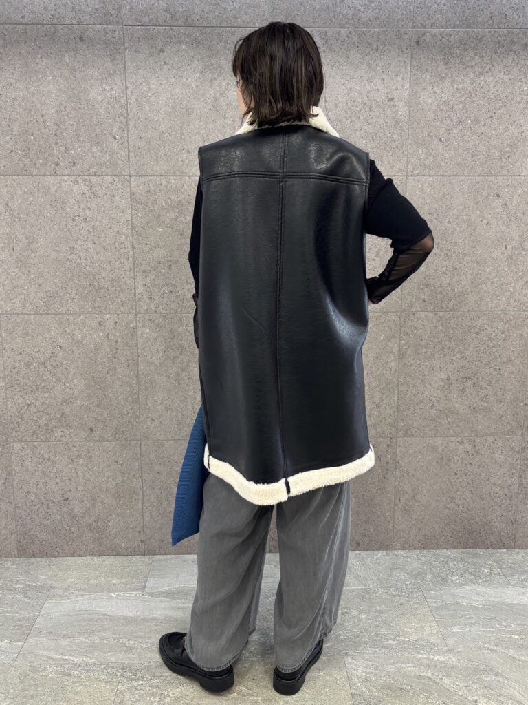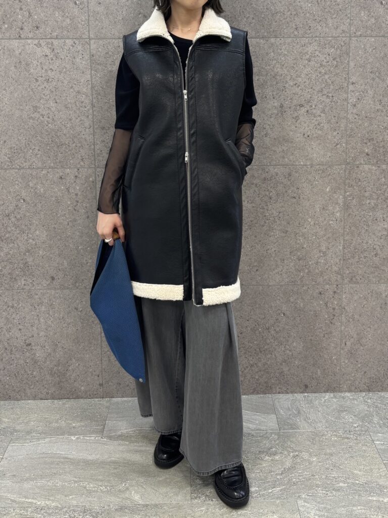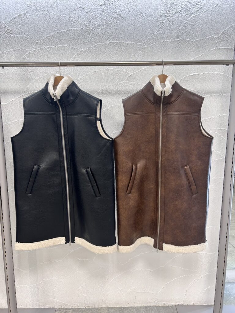 前回展で人気だった合皮とボア素材がボンディングされた生地で、今回はジレとなって再登場!!襟を折って、ボア部分を出して着用しても、上までファスナーを上げて少しクールに着こなしていただくのもおすすめです。裾に少しボア面が出ていることで、クールになりすぎず少しの抜け感が演出されます。デニムやスラックス、ロングスカートとのスタイリングがおすすめです。