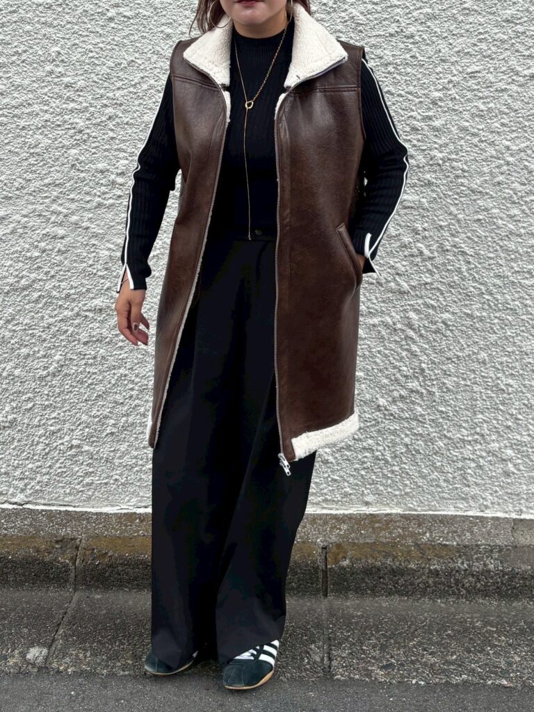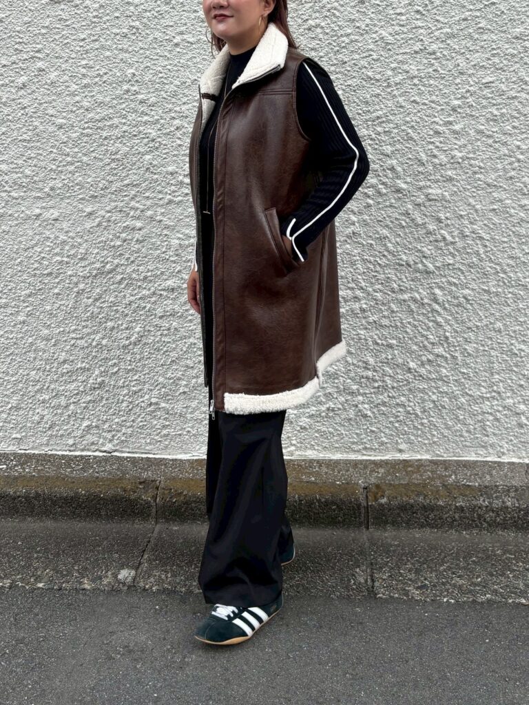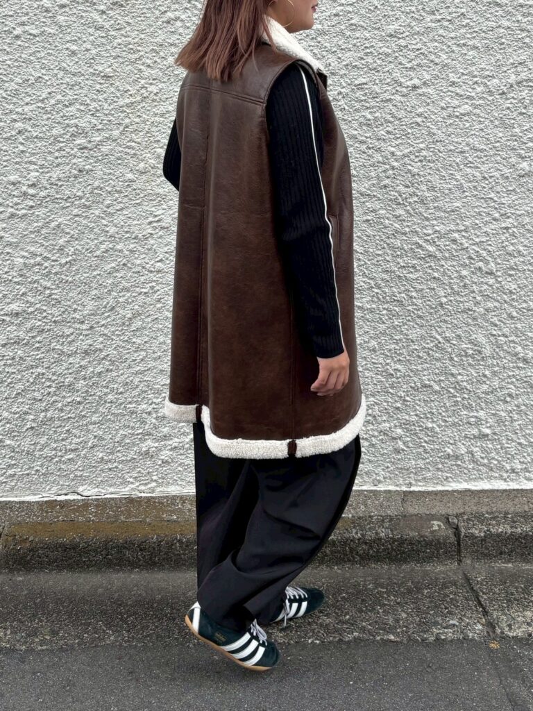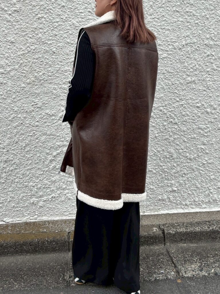 前回展で人気だった合皮とボア素材がボンディングされた生地で、今回はジレとなって再登場!!襟を折って、ボア部分を出して着用しても、上までファスナーを上げて少しクールに着こなしていただくのもおすすめです。裾に少しボア面が出ていることで、クールになりすぎず少しの抜け感が演出されます。デニムやスラックス、ロングスカートとのスタイリングがおすすめです。