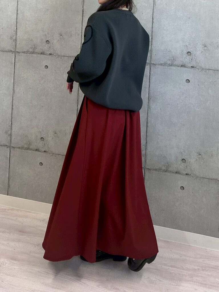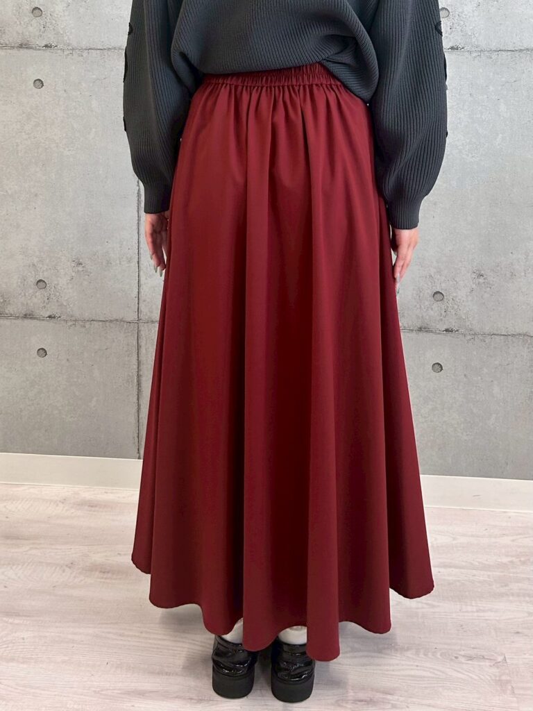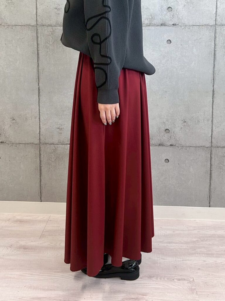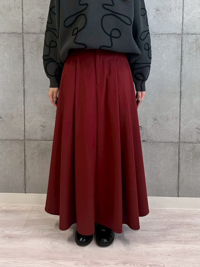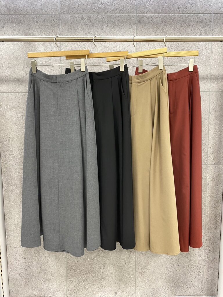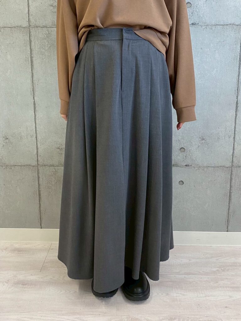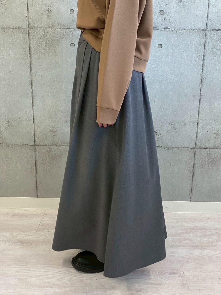 キレイ目の素材でおつくりしているAラインスカートです。サイドに2つずつタックが入っているので、ウエスト周りはスッキリ着こなしていただけます。インのスタイリングでも、トップスをアウトしてフレアスカートとして着用するのもおすすめです。