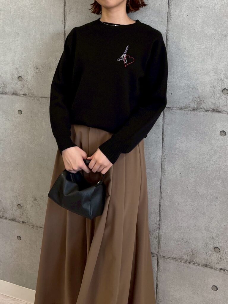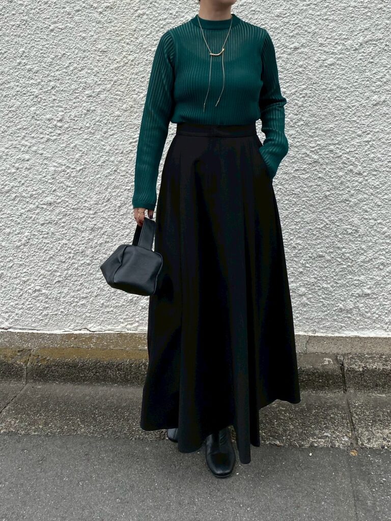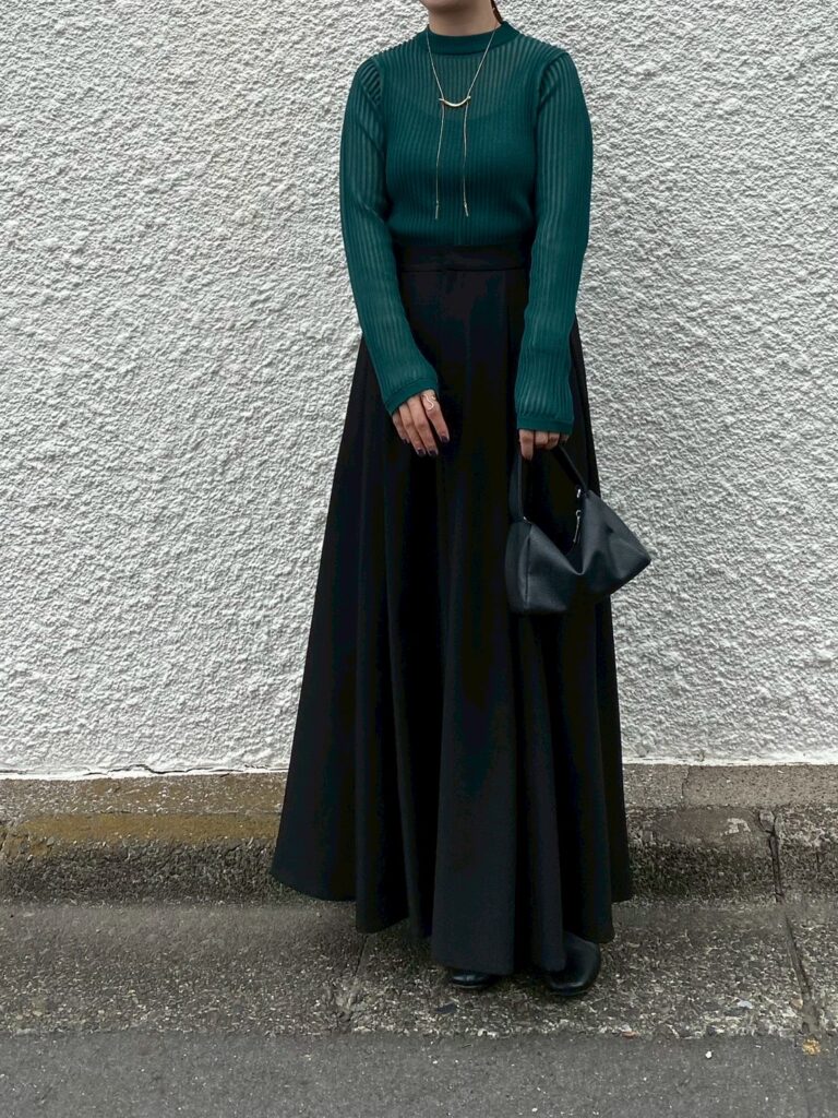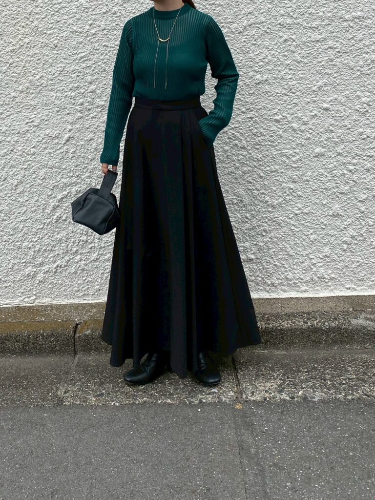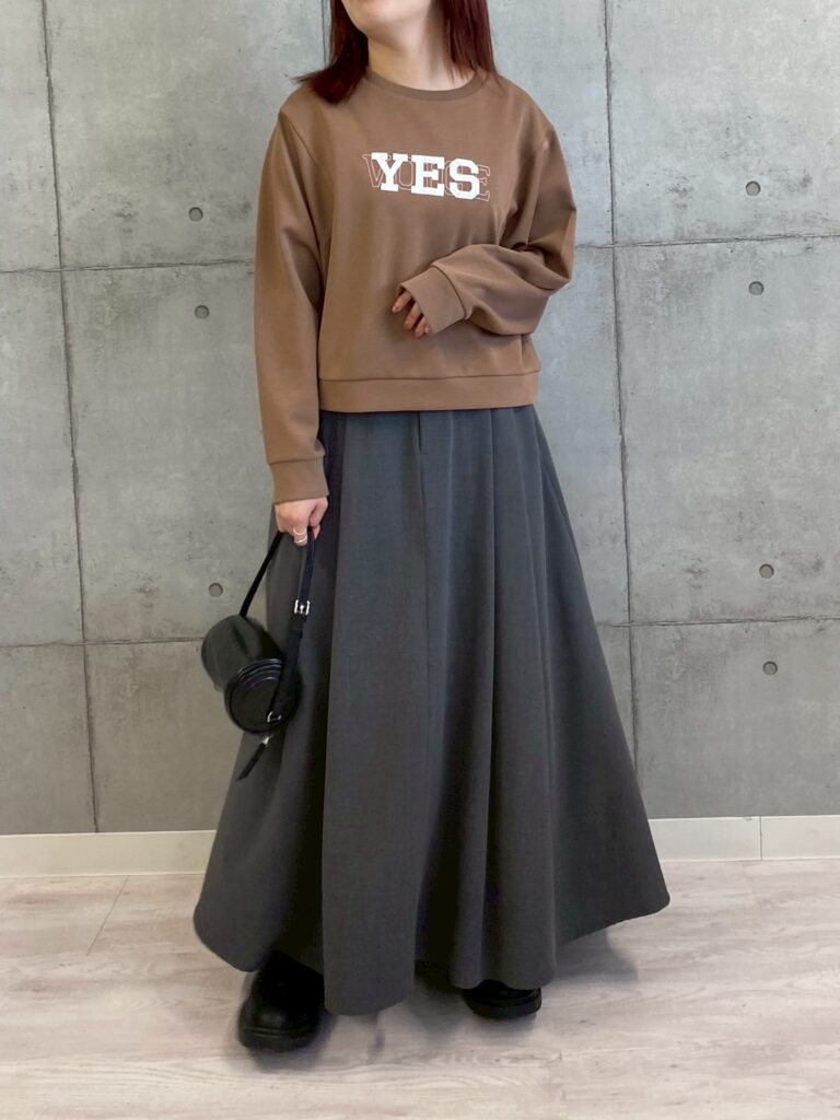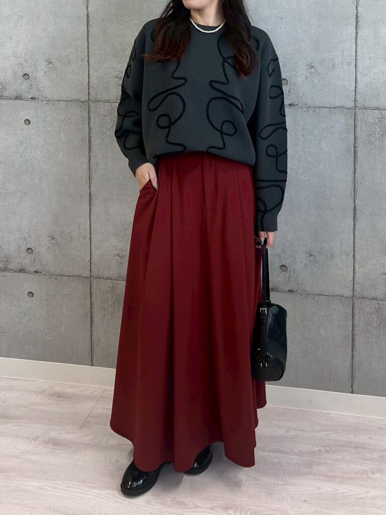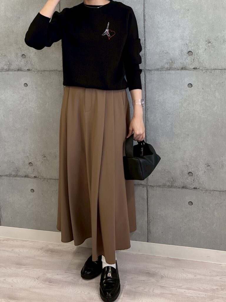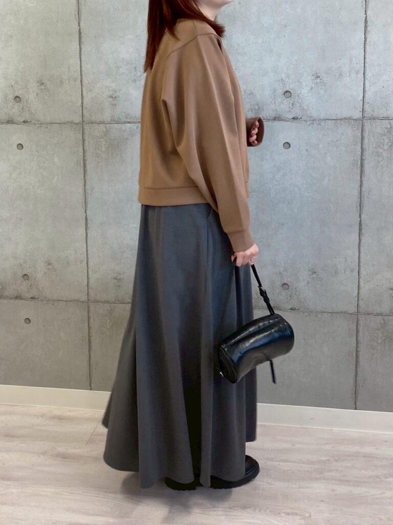 キレイ目の素材でおつくりしているAラインスカートです。サイドに2つずつタックが入っているので、ウエスト周りはスッキリ着こなしていただけます。インのスタイリングでも、トップスをアウトしてフレアスカートとして着用するのもおすすめです。