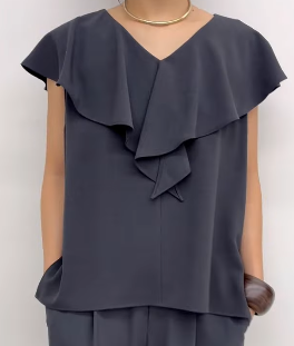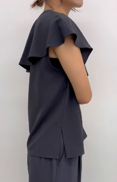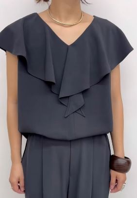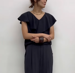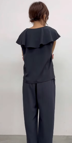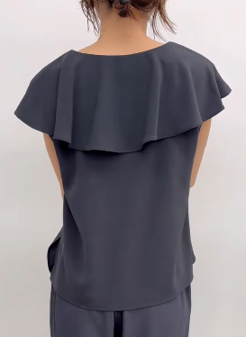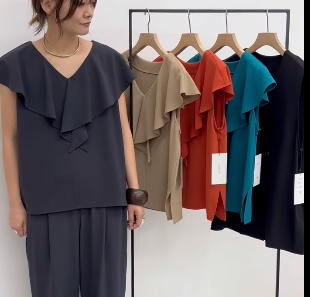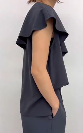 今季トレンドのフリルデザインが特徴のブラウスは前後着用可能アイテム。